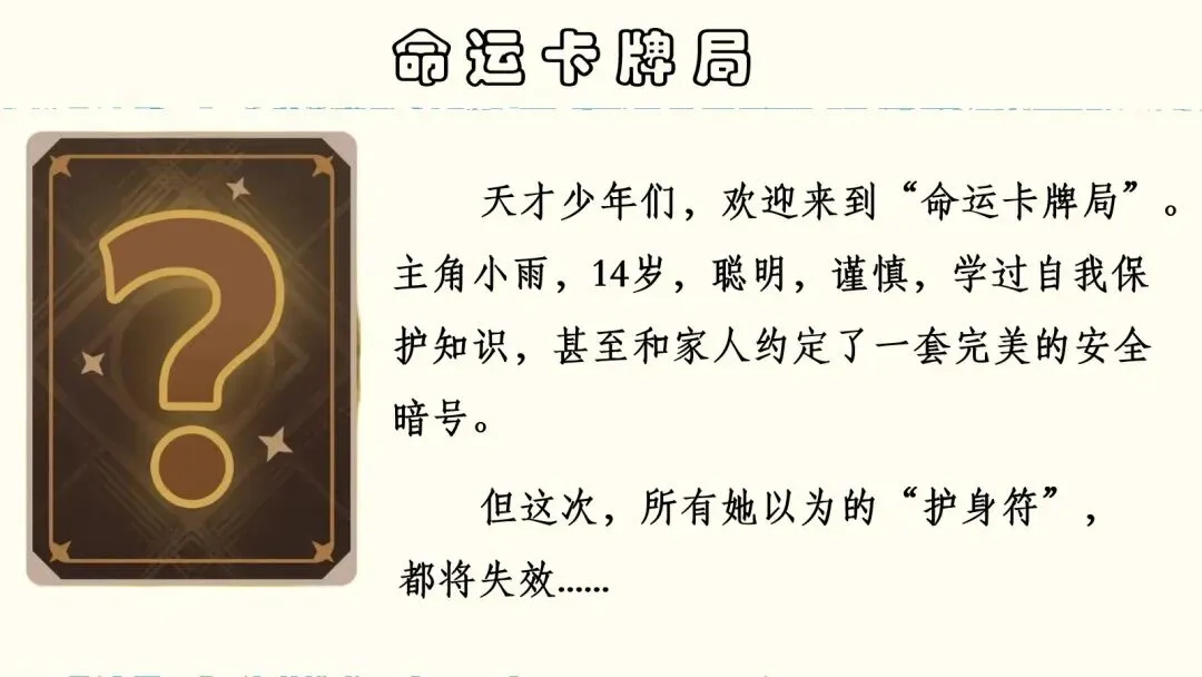 本课以“命运卡牌”为模拟情境,学生化身守护者,卡牌闯关,步步为营。