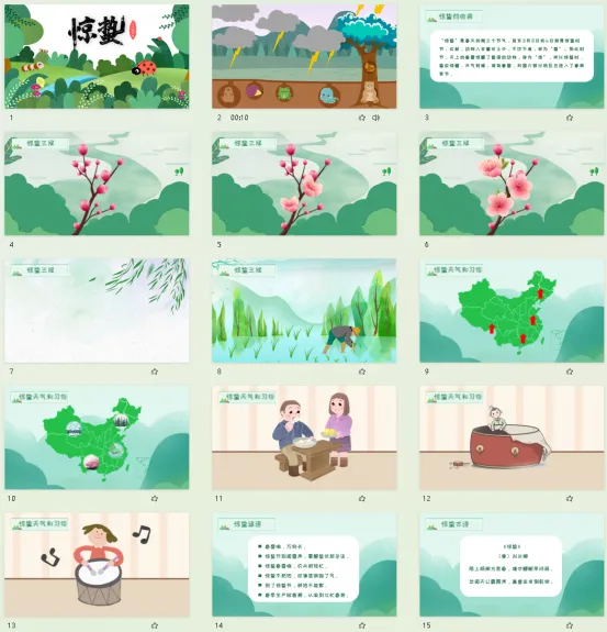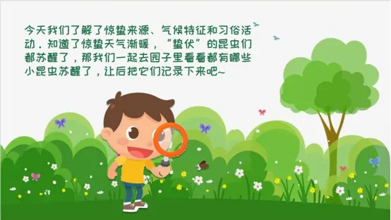 教师:刚刚小朋友们听到的雷声是春天的第一声雷,这个雷声非常的厉害哦~它能叫醒很多植物和动物。民间就有“春雷响,万物长。惊蛰节到闻雷声,震醒蛰伏越冬虫。”这样的谚语。