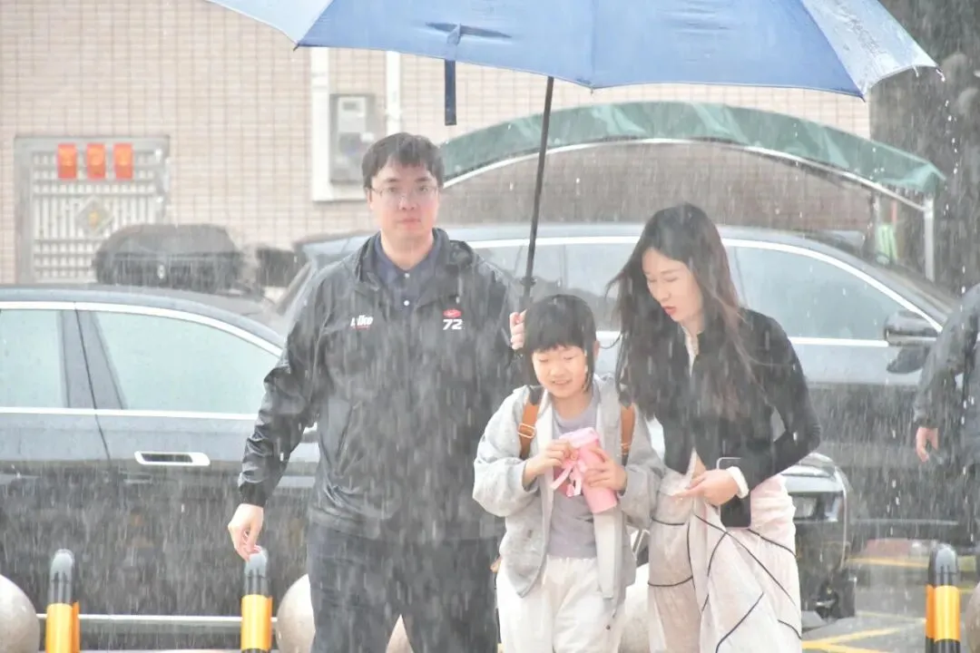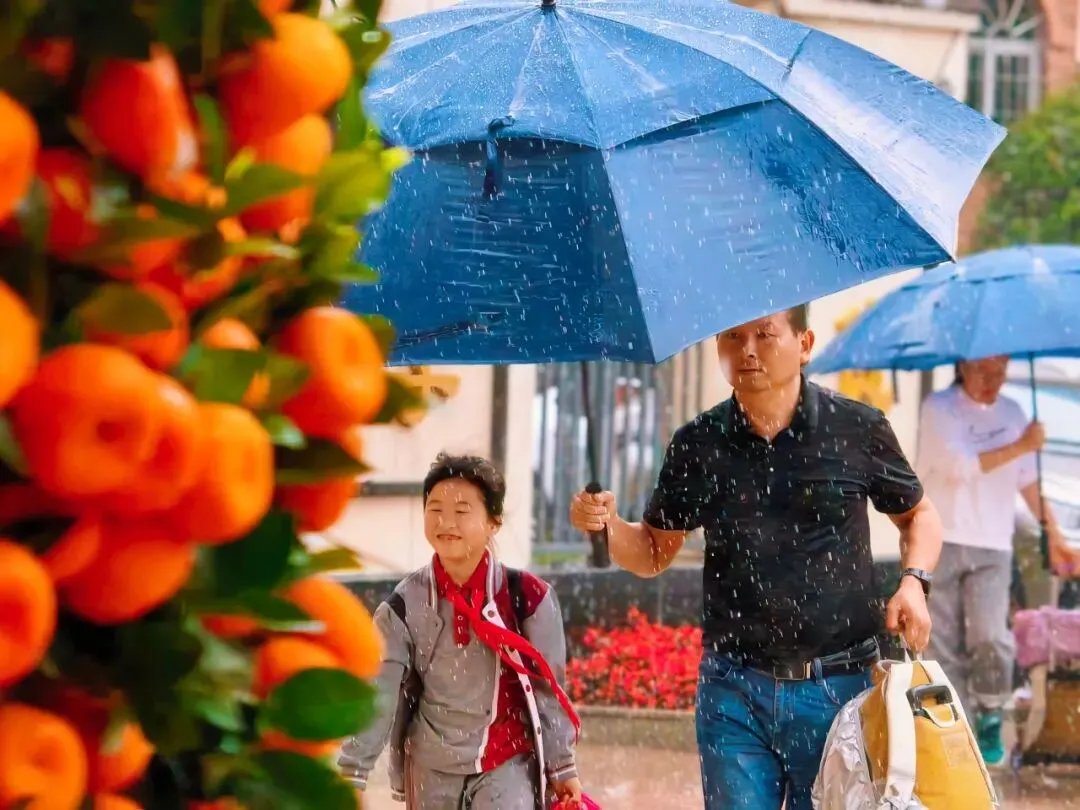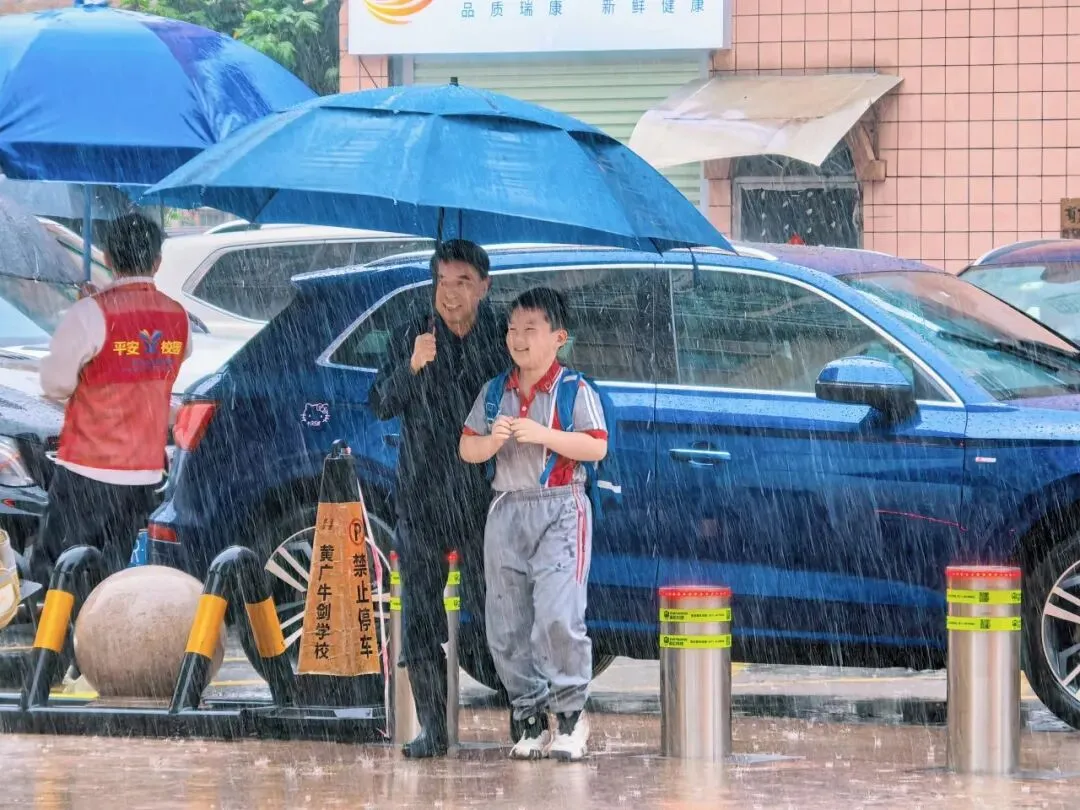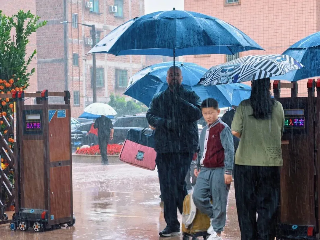 为冒雨返校的学生和家长