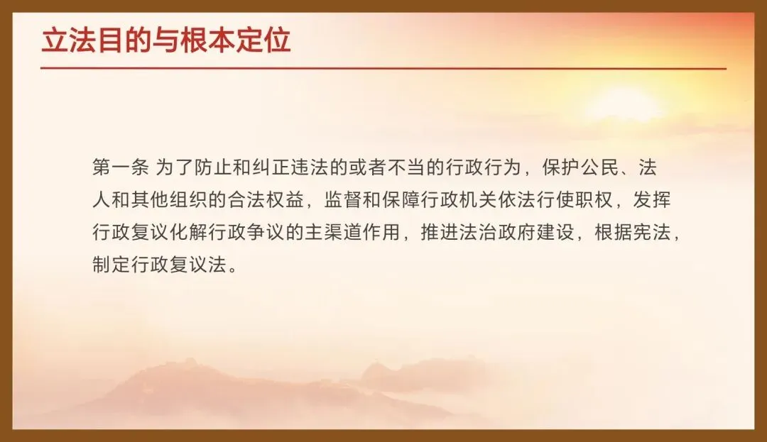 要理解一项法律制度,必须从其立法目的入手。新《行政复议法》第一条规定:“为了防止和纠正违法的或者不当的行政行为,保护公民、法人和其他组织的合法权益,监督和保障行政机关依法行使职权,发挥行政复议化解行政争议的主渠道作用,推进法治政府建设,根据宪法,制定本法。” 与旧法相比,此条文有四个关键变化,清晰地揭示了行政复议在新时期的根本定位。