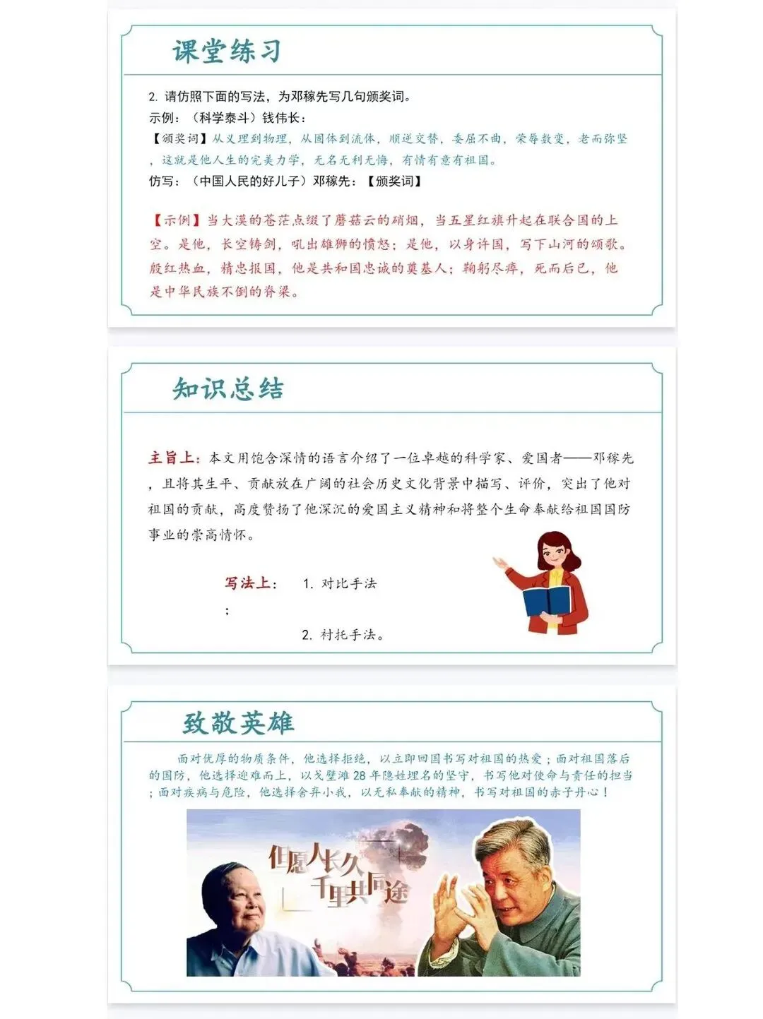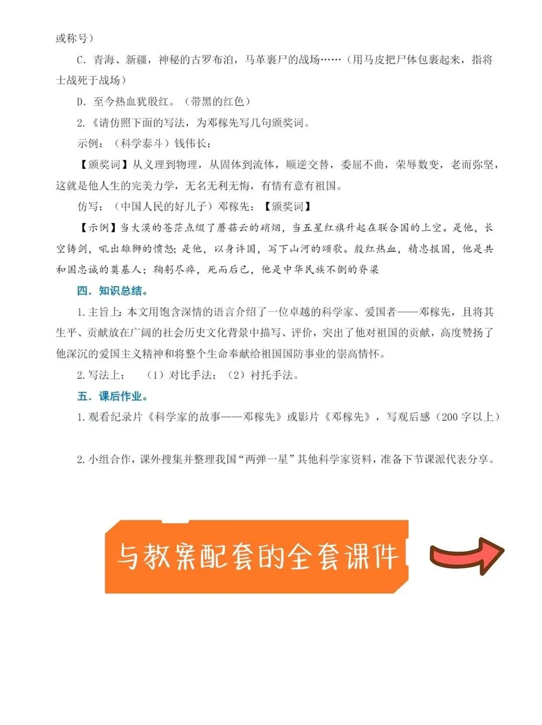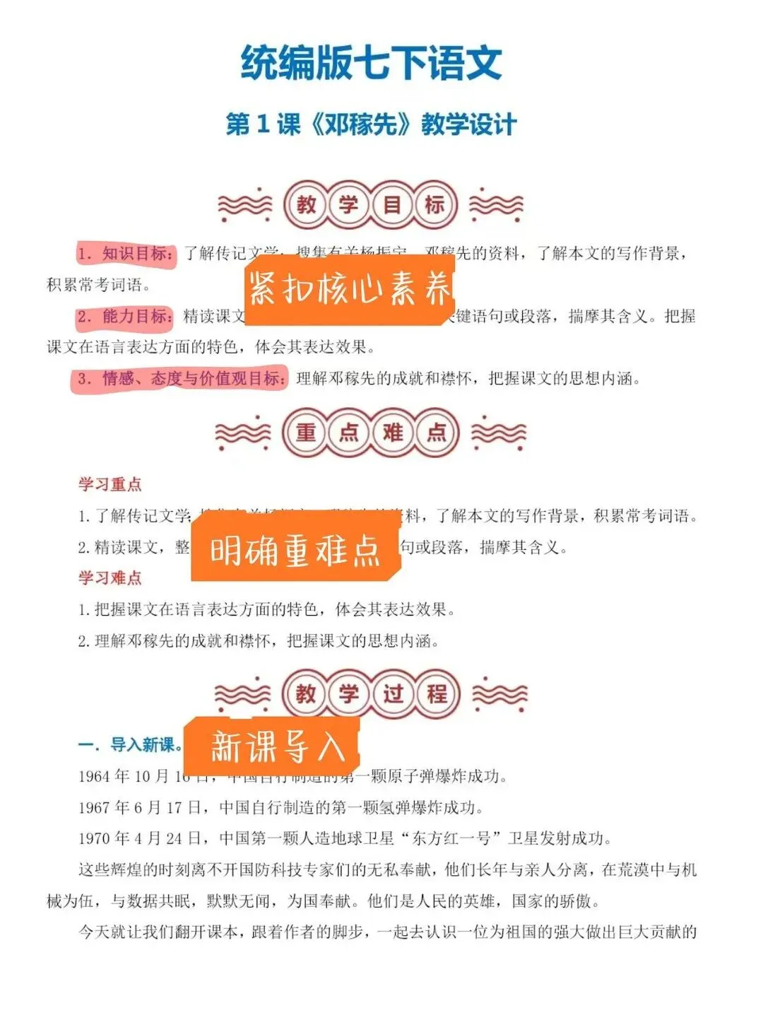 【核心素养教案+配套教案的 PPT课件】 备课效率翻倍! 新学期备课压力山大?这套七年级下册语文顶配教案,帮你从繁重的案头工作中解放出来 [一R][彩虹R]内容全覆盖 内容十分详细,从大单元教学到每一课时的设计,再到每一个思考题,从宏观到微观,教案覆盖面广! [二R][彩虹R]文件格式简练 全册教案整合在一个文件里,随需随用,下载可打印,十分实用! [三R][彩虹R]教案内容详实 七年级下册语文《邓稼先》课时教学设计部分截图展示如上,每课都配有详细的教学目标设计、教学流程,课后作业,配套的课件完全贴合教案!拿来就能用!本文内容来源于网络 版权归原作者所有、如有侵权,联系删除