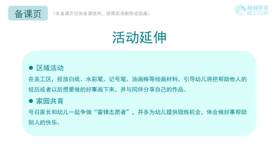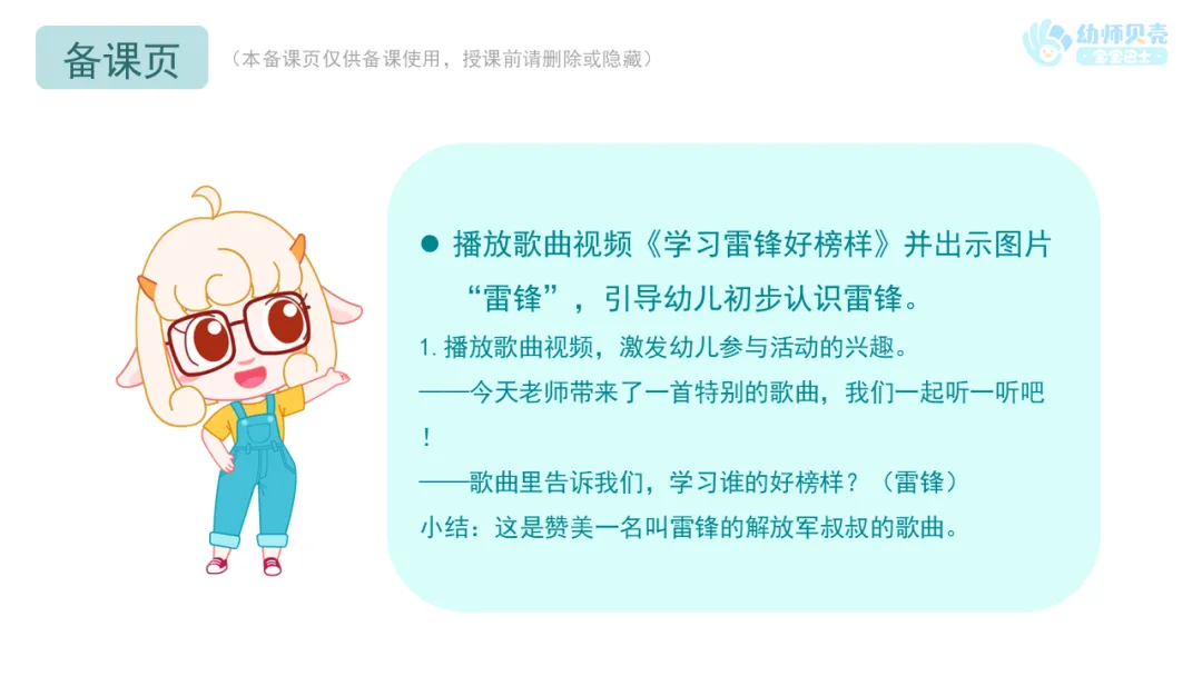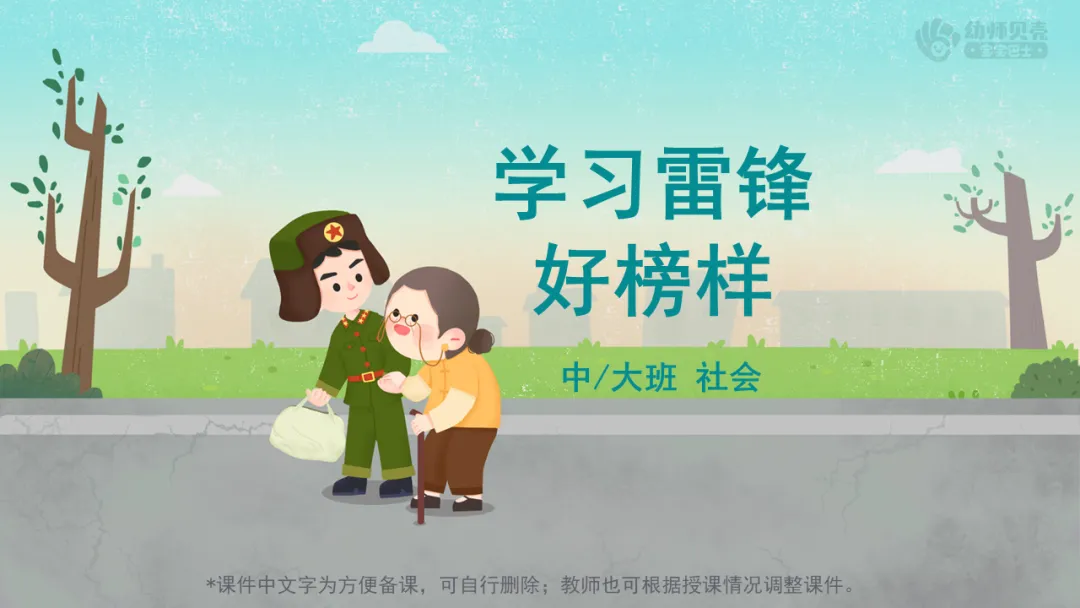 l课件准备:《学习雷锋好榜样》歌曲视频;《雷锋故事》故事音频及图片;“雷锋”图片;“帮助他人”组图。