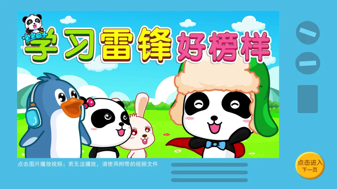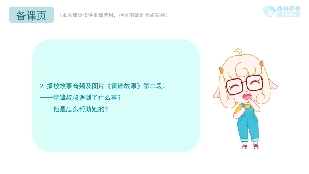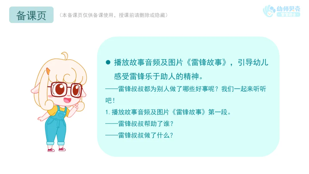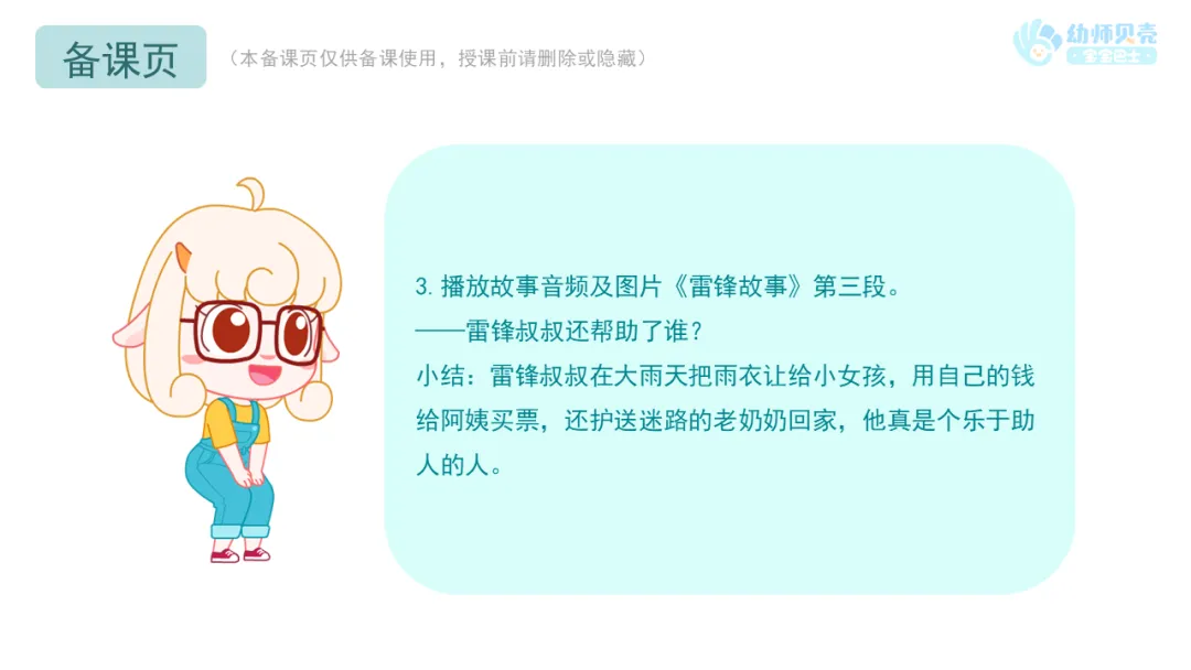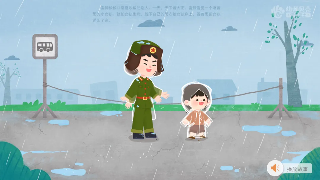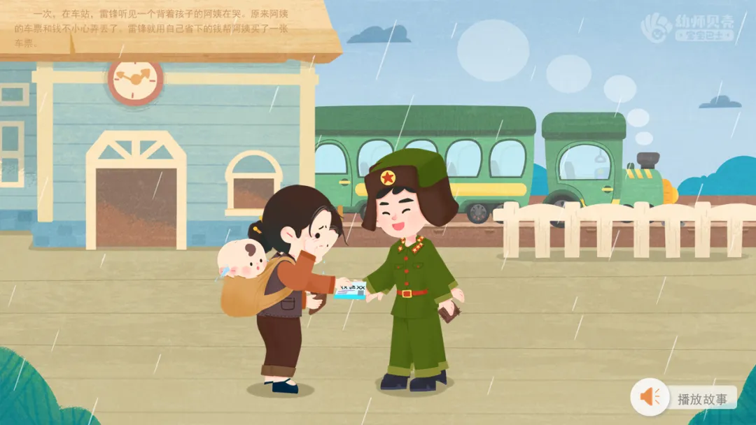 l播放故事音频及图片《雷锋故事》,引导幼儿感受雷锋乐于助人的精神。