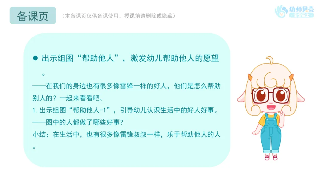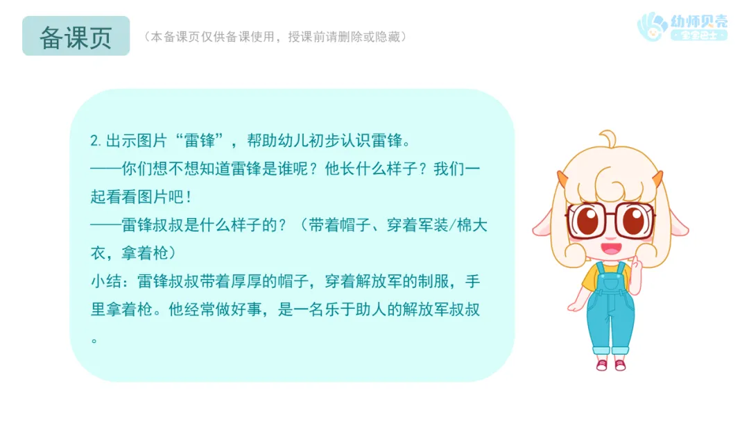 ——雷锋叔叔最愿意帮助别人、做好事,今天我们也来学做“小雷锋”,帮助身边的人吧!