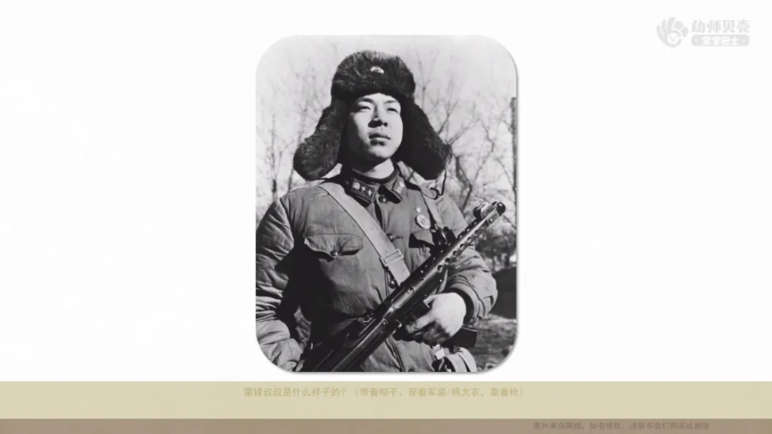 ——雷锋叔叔是什么样子的?(带着帽子、穿着军装/棉大衣,拿着枪)