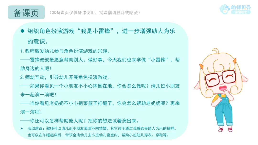 l组织角色扮演游戏“我是小雷锋”,进一步增强助人为乐的意识。
