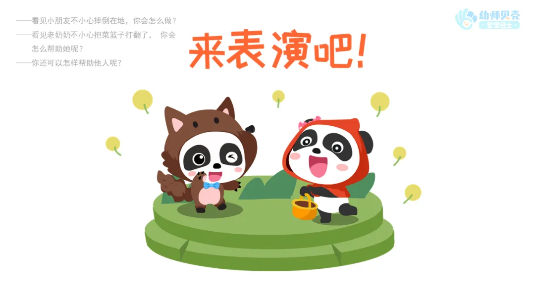 ——当你看见老奶奶不小心把菜篮子打翻了,你会怎么帮助老奶奶呢?再来演一演吧!