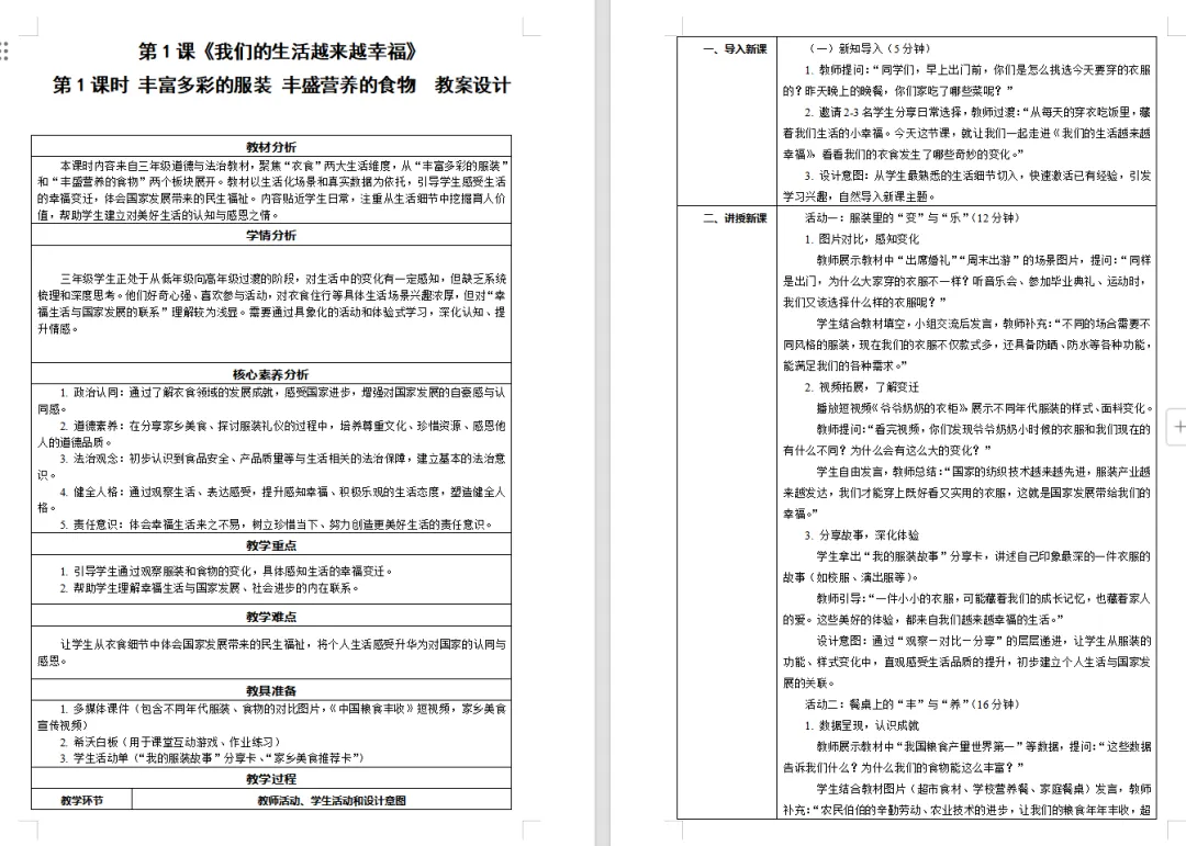 >【道德与法治教案课件】新教材部编版小学道德与法治三年级下册核心素养表格配套课件(含反思)第1课《我们的生活越来越幸福》