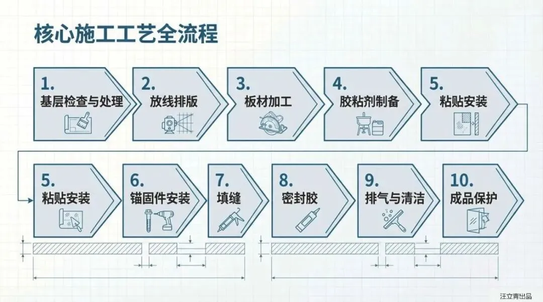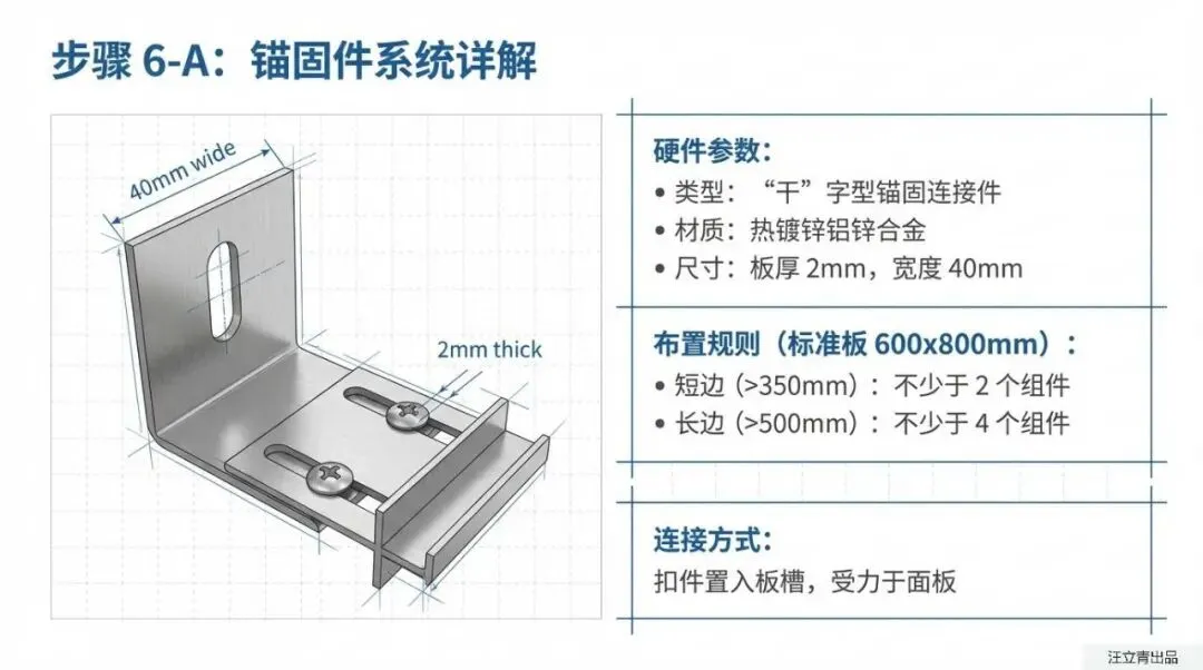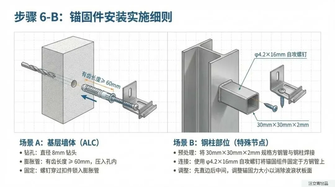 你以为给大楼穿这种“冲锋衣”就是简单糊上去的吗?大错特错,这背后的施工工艺精细得堪比“外科手术”!首先,大楼原本的ALC外墙得先经过严格的界面剂、防水和找平处理,平整度误差被死死卡在5毫米以内,连肉眼都看不出明显凹凸。等墙面搞利索了,这套一体板采用的是“粘锚结合”的硬核战术。施工队不仅要精准调配专属的粘结砂浆,保证板材和墙面的有效粘结面积绝对不低于80%,更关键的是它还用到了特制的“干”字型热镀锌铝锌合金锚固件。针对这种装配式钢结构,工人甚至会先将方钢管焊在钢柱上,再用自攻螺钉把锚固组件死死咬住。这种“满汉全席”级别的双重固定,哪怕是狂风暴雨也别想撼动它分毫。