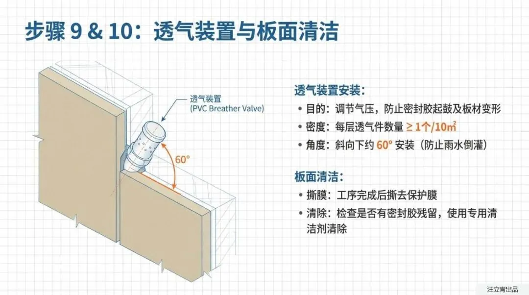 最绝的还是它对细节那种变态级的死磕!板子拼完就完事了?远远不够。为了防止渗水,板缝里得先按比例塞满PE棒,然后再打上深度绝不缩水的中性耐候硅酮密封胶。最让人拍案叫绝的是,施工团队还在密封胶凝固前,在板缝间偷偷塞进了一个个斜向下的PVC材质“透气阀”。这小玩意儿简直就是整面墙的“呼吸道”,它能自动调节保温装饰板和墙体之间的气压,彻底解决密封胶起鼓、板材变形的行业绝症。从红外水平仪精准放线、精确到误差2毫米以内的机器裁板切割,到最后撕下保护膜用专用清洁剂去除残胶,每一步的质量控制都被拿捏得死死的。