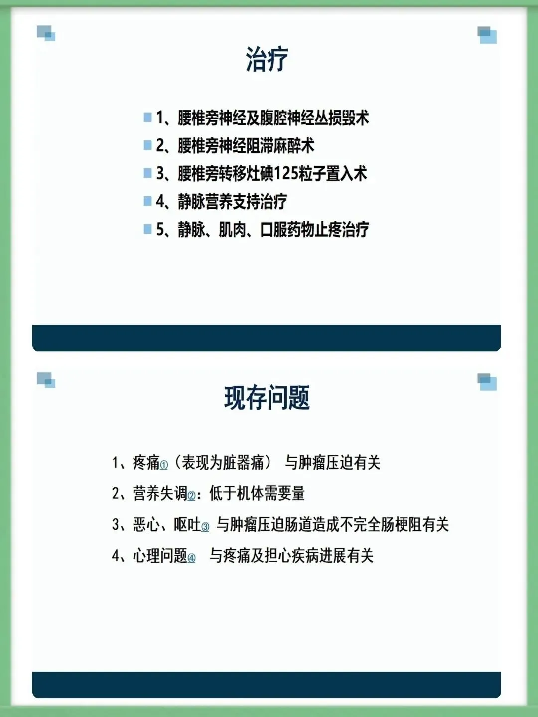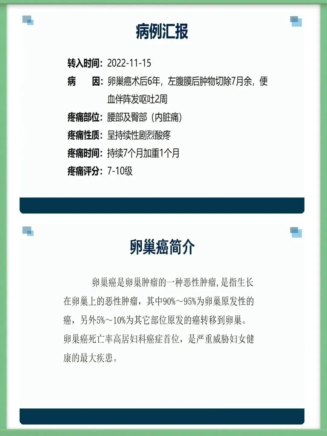 今天,非常荣幸能与大家分享一例令我印象深刻的病例。患者是一位42岁的郑女士,她因“卵巢癌术后6年,腹膜后转移,伴剧烈疼痛及消化道出血”入院。入院时,她的状况非常令人揪心。最突出的问题是“疼痛”,一种因肿瘤压迫引起的持续性剧烈酸痛,部位在腰部和臀部,疼痛评分高达7-10级。大家可以想象,这已经达到了重度疼痛的级别,不仅睡眠严重受扰,生活也完全被痛苦笼罩。同时,由于肿瘤压迫肠道导致呕吐,加上晚期消耗,她的血红蛋白只有33g/L,白蛋白也偏低,存在严重的营养失调。她的眼神里,除了病痛,还有深深的焦虑和对疾病的恐惧。