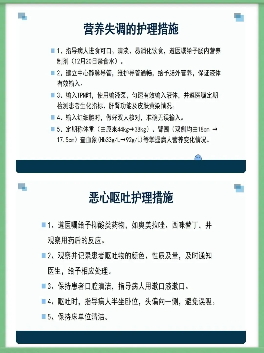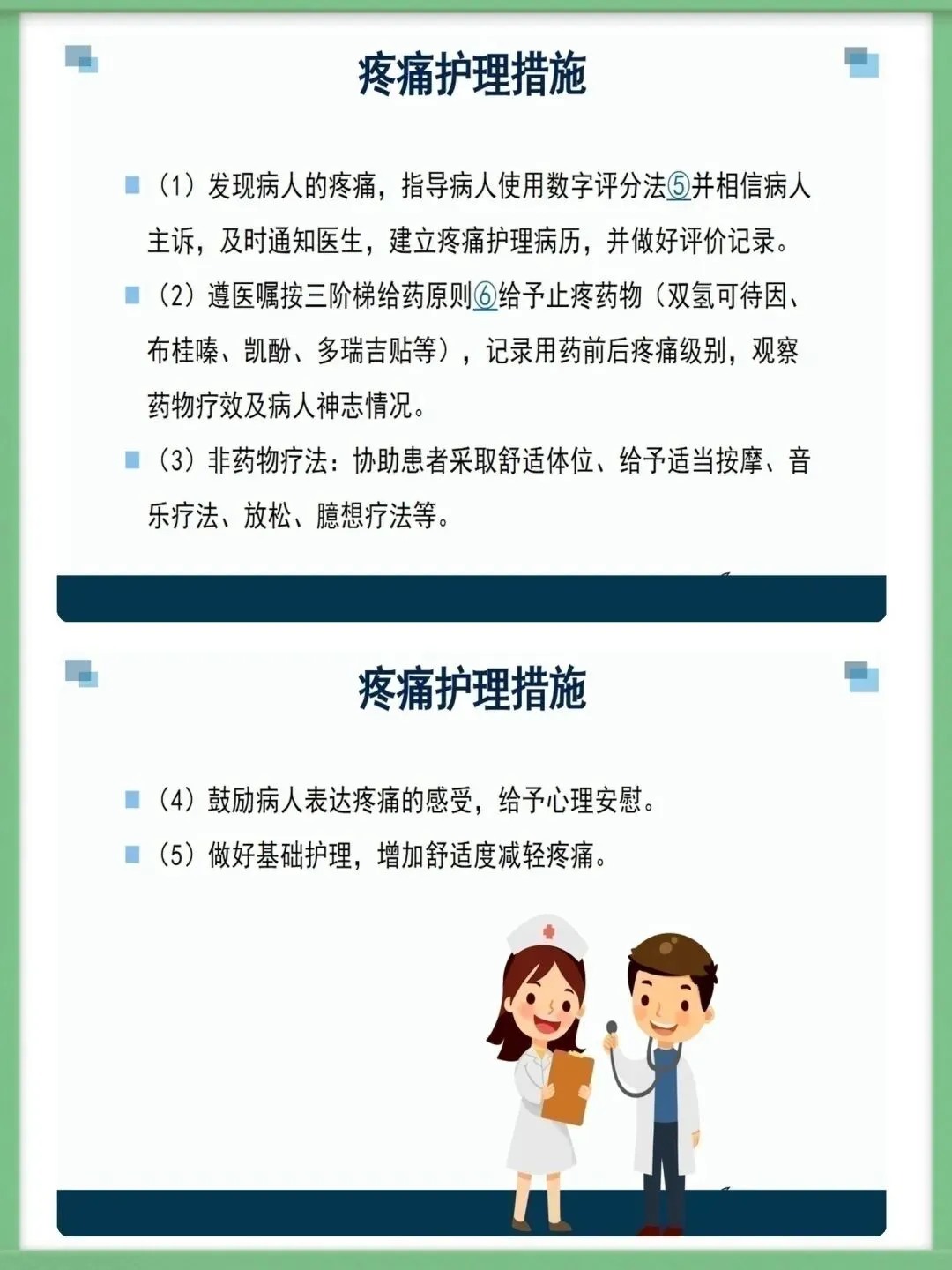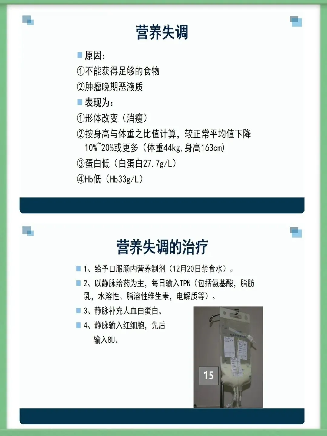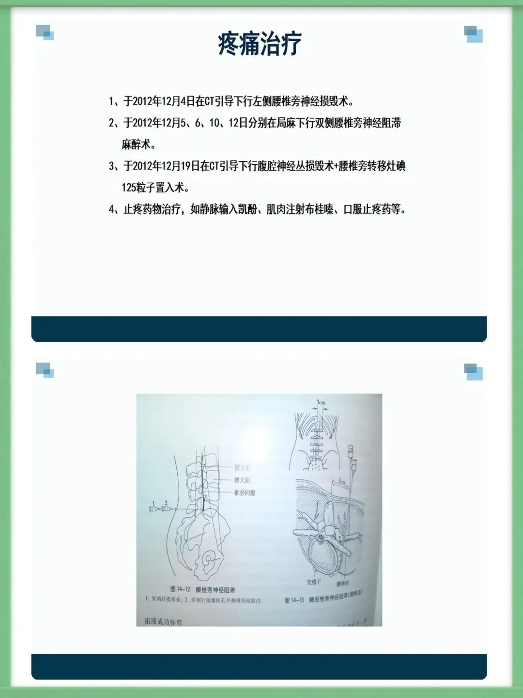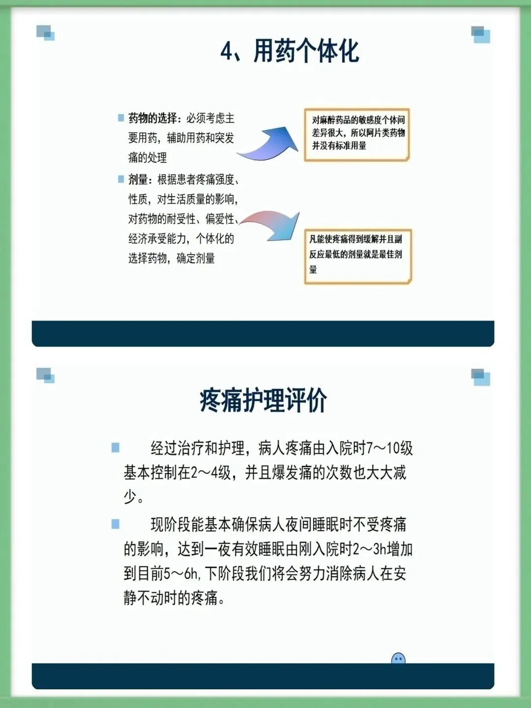面对这位被病痛折磨的患者,我们的核心护理目标非常明确:首要,是缓解疼痛,恢复她的基本生活品质;其次,是改善营养,增强她的体质。在疼痛管理上,我们采取了“多模式镇痛”的策略。除了遵医嘱按WHO三阶梯原则给予静脉、肌注和口服止痛药外,还配合医生为患者实施了腰椎旁神经损毁、阻滞以及腹腔神经丛损毁等介入治疗,并植入了碘125粒子进行内放疗。在护理中,我们始终相信她的疼痛主诉,教会她使用数字评分法,并辅以舒适的体位、音乐疗法和心理安慰。同时,我们为她建立了中心静脉通路,保证肠外营养和输血能够有效输入,以纠正严重的贫血和低蛋白。经过努力,我们看到了希望。郑女士的疼痛从最初的7-10级,基本控制在了2-4级。最重要的是,她每晚的有效睡眠时间,从入院时的2-3小时,增加到了5-6小时。这虽然只是第一步,但对她而言,是重获生活尊严的重要一步。这个病例让我深刻体会到,对抗癌痛,需要我们既要有专业的镇痛手段,更要有不放弃的温暖守护。用心去倾听,用专业去缓解,这是我们能给患者最坚实的支持。我的分享到此结束,谢谢大家。