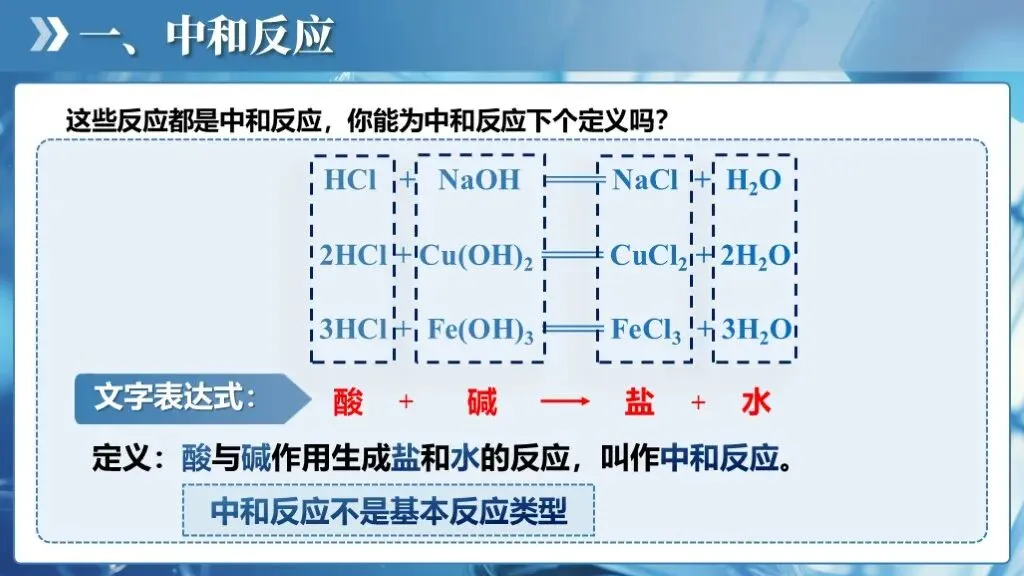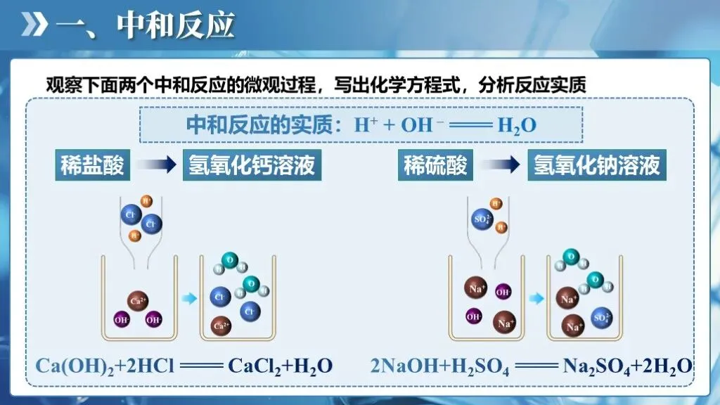 2.能从微观角度了解中和反应的原理,并会正确书写中和反应的化学方程式。