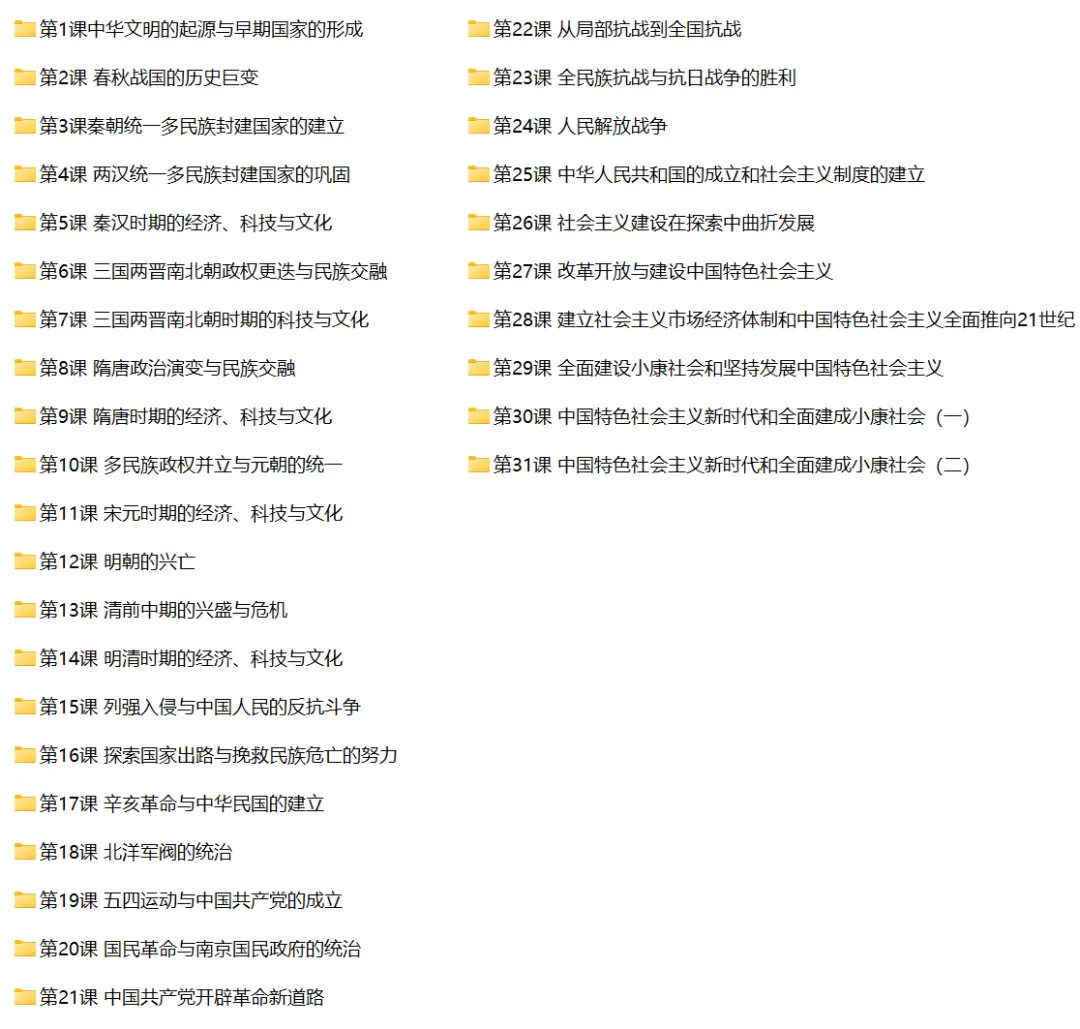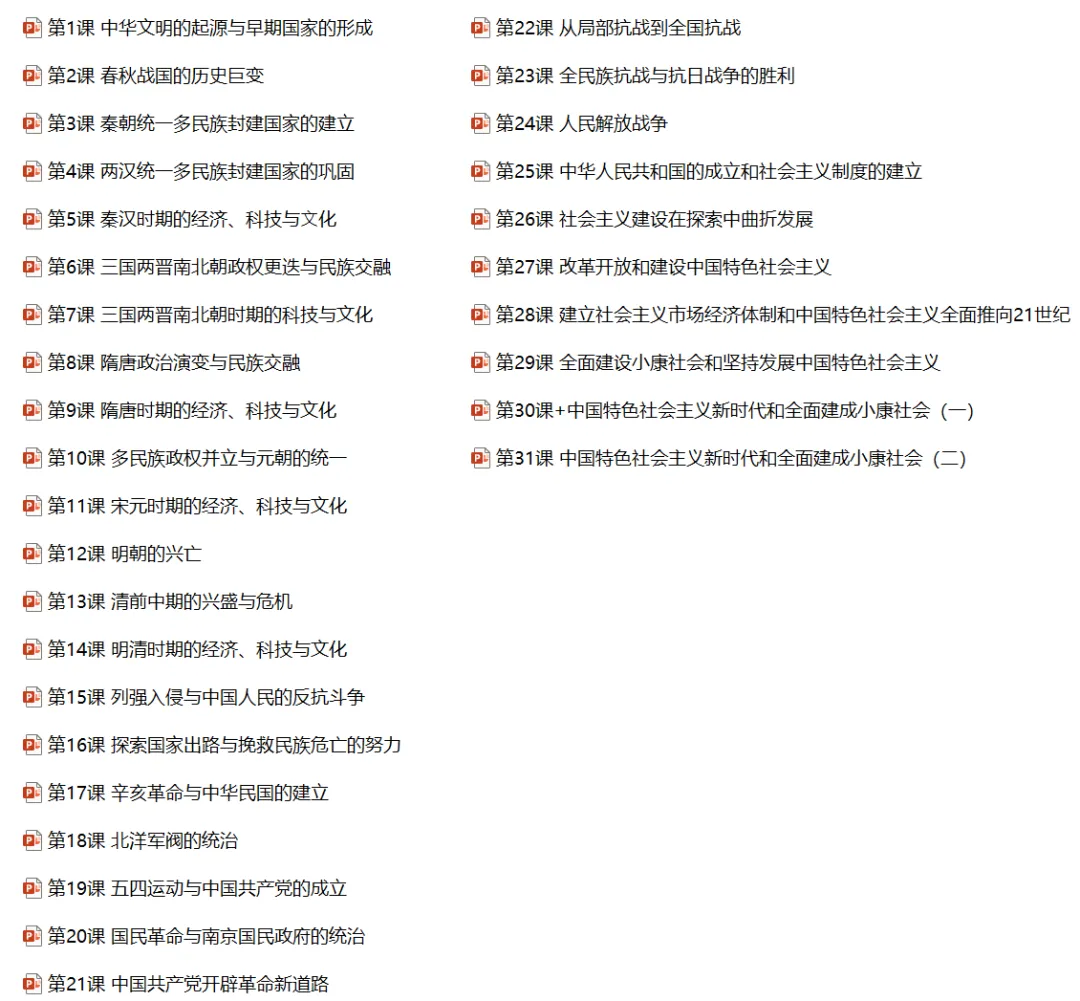 老师们好, 今天推送的是《中国历史》课件,希望能助力各位老师在新的学期高效备课。《中国历史》系统讲述中华民族5000多年辉煌灿烂的文明史、中国近代以来180多年争取民族独立国家富强的抗争史和中国共产党100多年为人民谋幸福为民族谋复兴的奋斗史,凸显中华优秀传统文化教育、“四史”教育、铸牢中华民族共同体意识教育,让学生在历史学习特别是党史学习中,深刻认识中国共产党的领导和社会主义道路是历史和人民的选择,坚定不移听党话、跟党走。