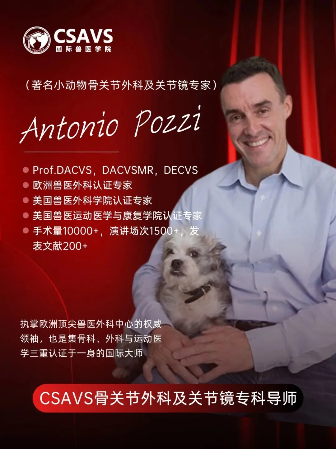 Antonio Pozzi 教授欧洲小动物关节镜权威专家、教科书《Canine and Feline Arthrology and Arthroscopy》(犬猫关节学及关节镜)原作者。现任苏黎世大学小动物外科临床中心主任,拥有美国兽医外科学院(ACVS)、欧洲兽医外科学院(ECVS)、美国兽医运动医学与康复学院(ACVSMR)三重认证,被誉为“大师们的老师”。