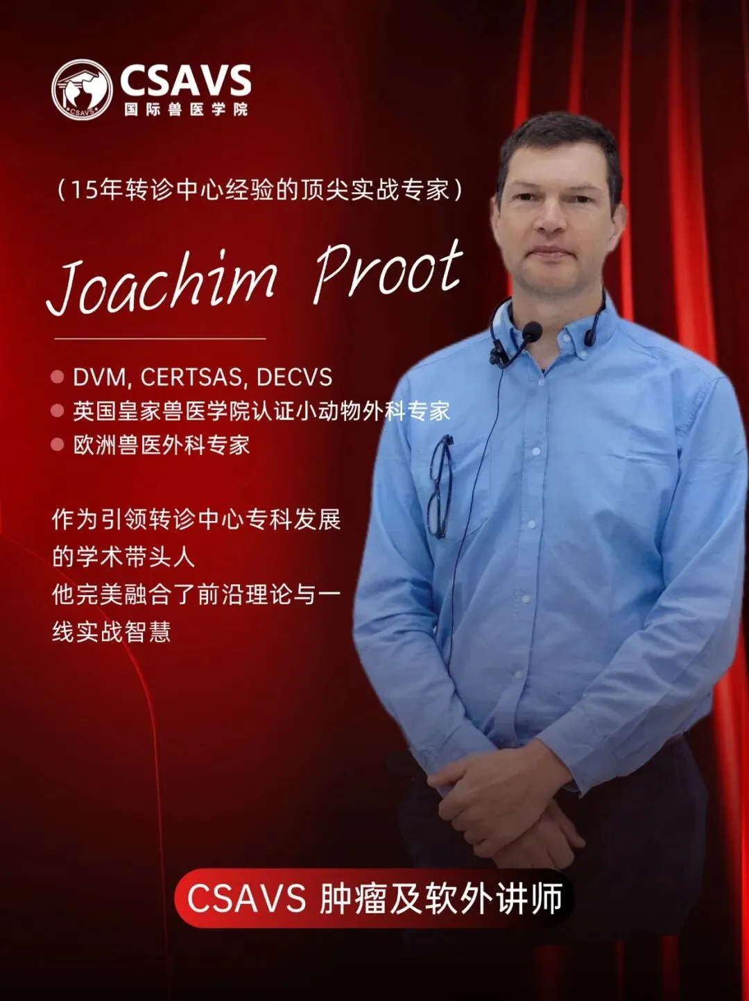 Joachim Proot 博士欧洲著名小动物外科专家,拥有20年肿瘤外科临床经验,三次来华授课,场场爆满。CSAVS肿瘤外科认证项目创始人,以“将复杂临床问题分解为清晰决策路径”的能力著称,课程实用性强,广受一线医生好评。