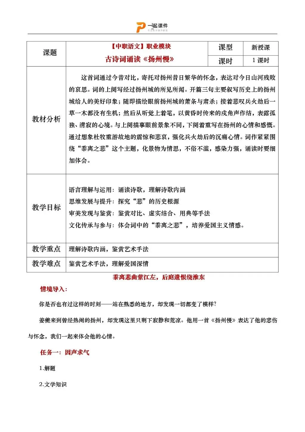>【中职语文职业模块】| 《扬州慢》:课件+教学设计