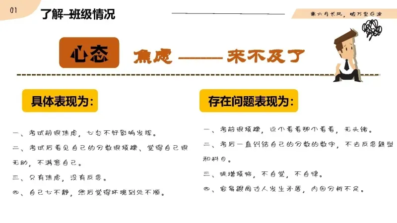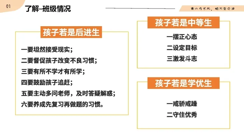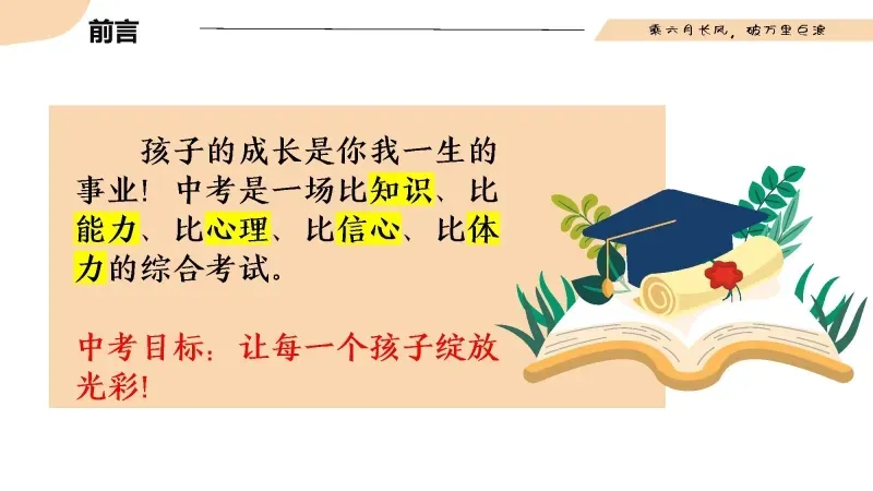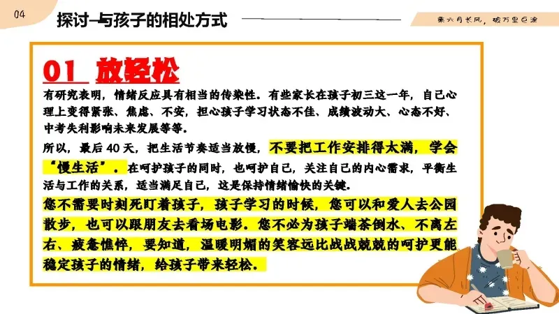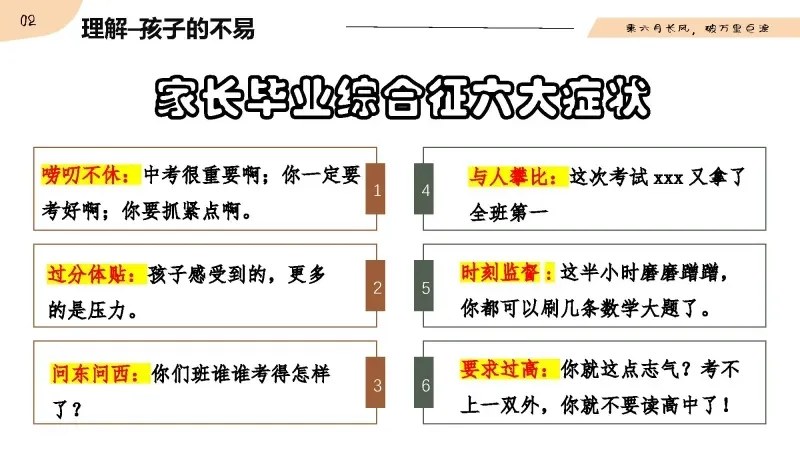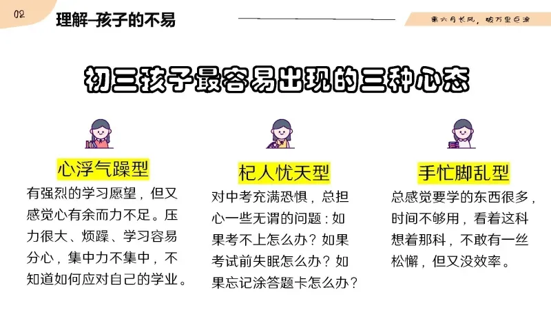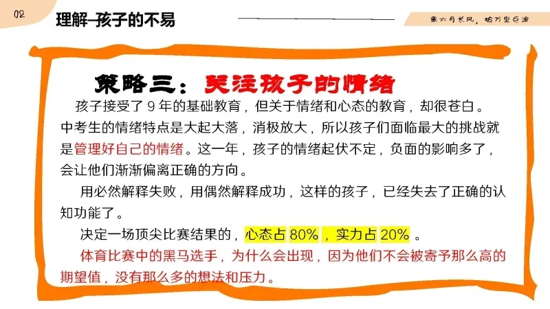 中考生的情绪特点是大起大落,消极放大,所以孩子们面临最大的挑战就是管理好自己的情绪。这一年,孩子的情绪起伏不定,负责的影响多了,会让他们渐渐偏离正确的方向。