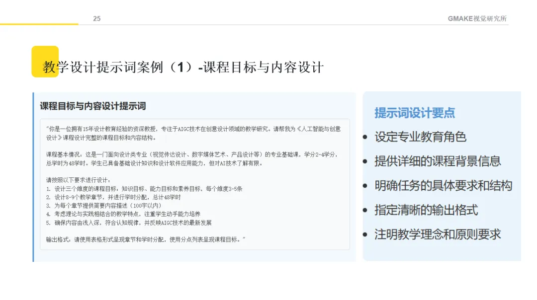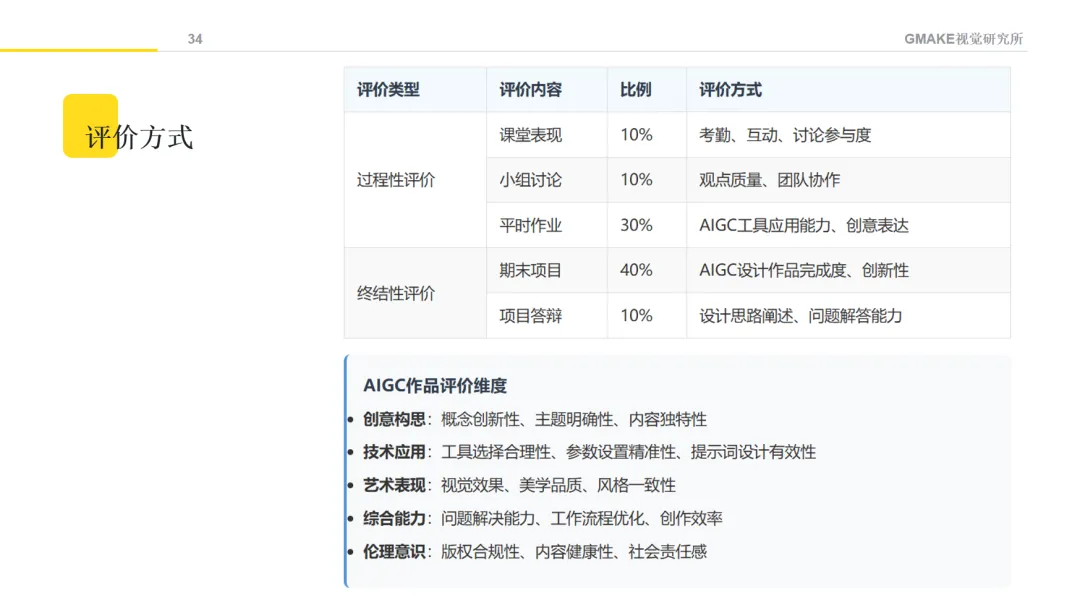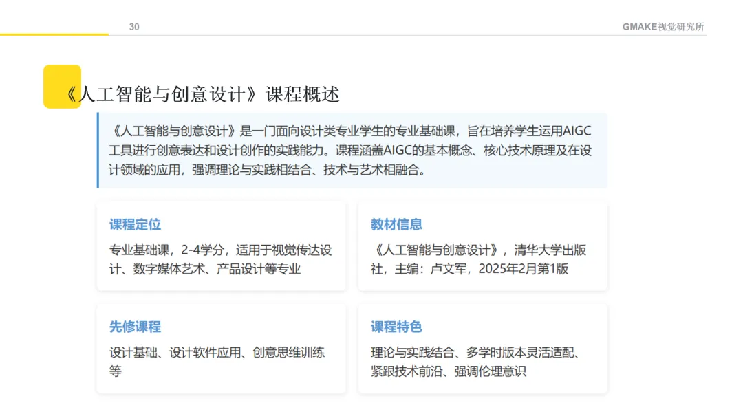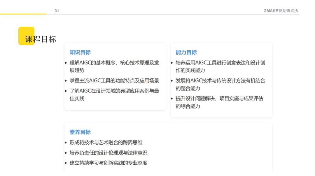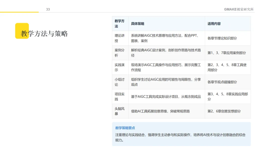 课程内容涵盖了从AI文本生成、图像创作、音视频制作,到设计思维与AI的融合等方面的基础知识。通过不同的教学方法,希望学生能理解AIGC的基本原理,并尝试将这些技术应用于设计创作。