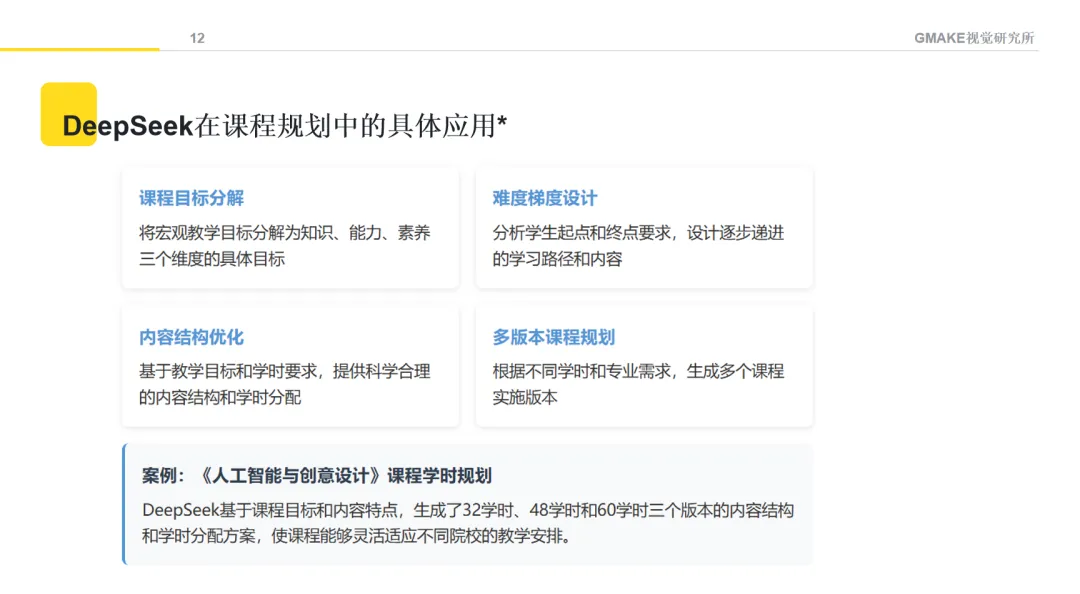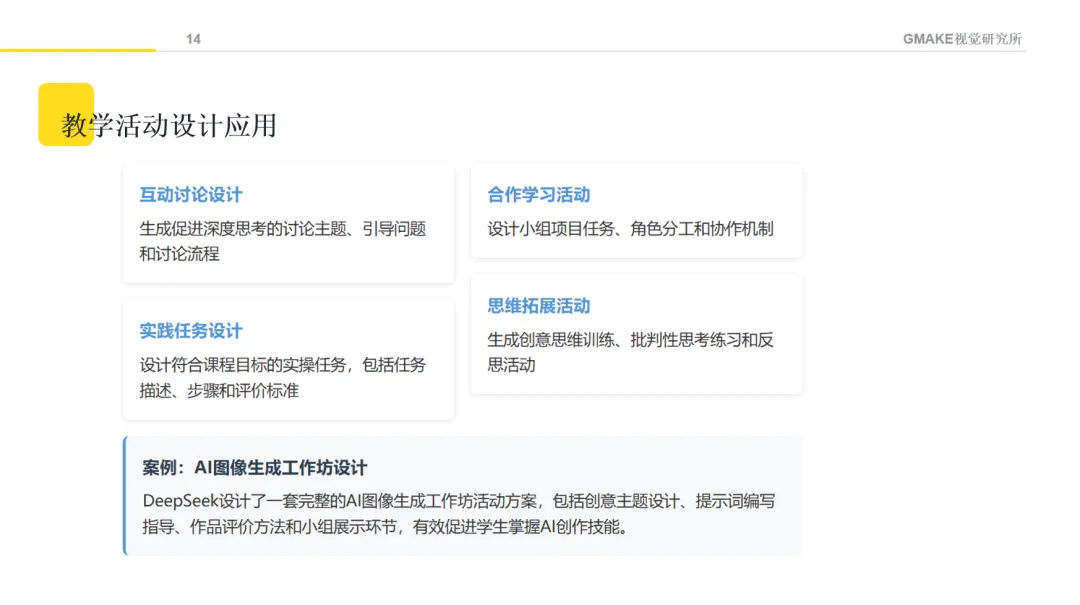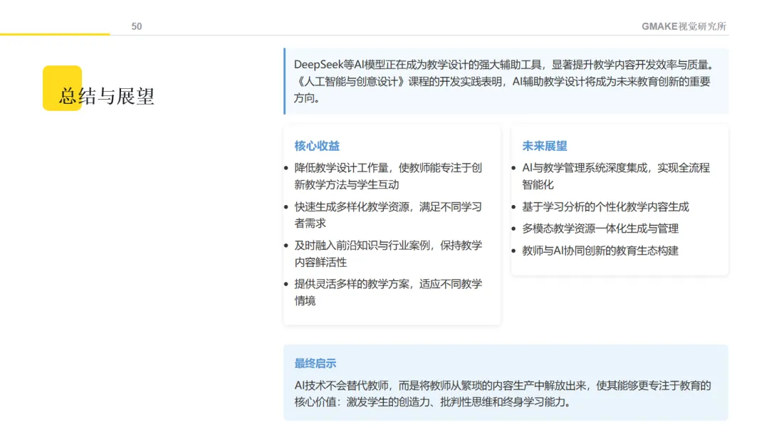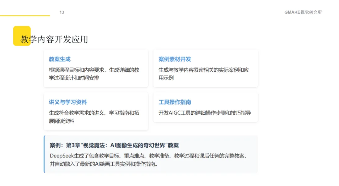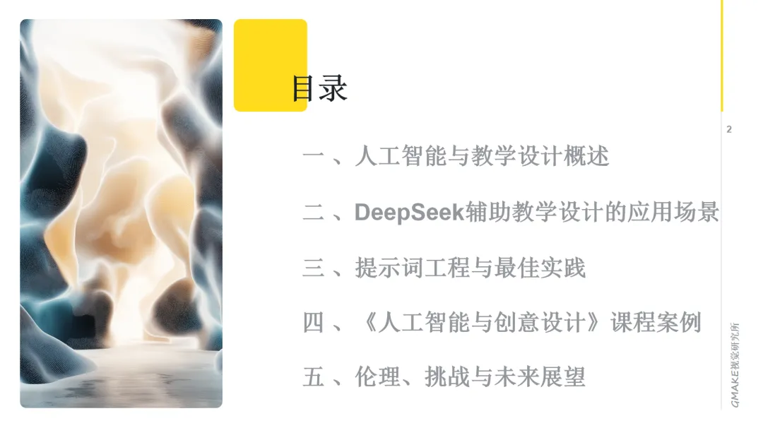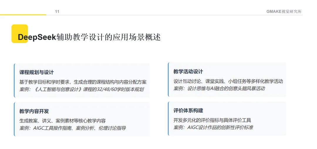 课程内容涵盖了从AI文本生成、图像创作、音视频制作,到设计思维与AI的融合等方面的基础知识。通过不同的教学方法,希望学生能理解AIGC的基本原理,并尝试将这些技术应用于设计创作。