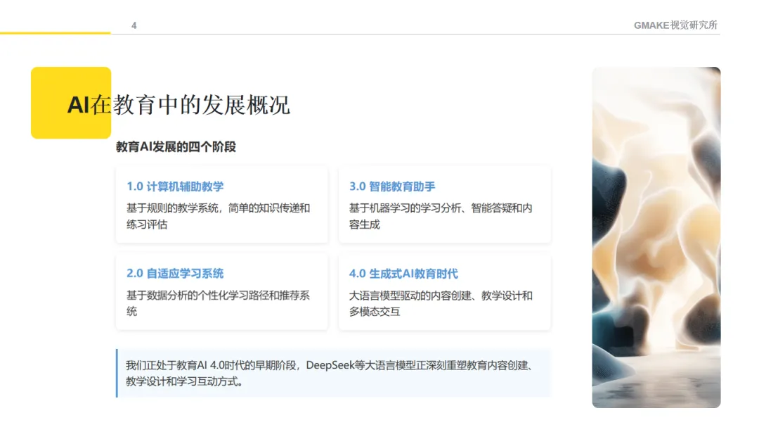 教育AI的发展大致经历了四个阶段:从最初的计算机辅助教学(基于规则的知识传递),到自适应学习系统(个性化学习路径),再到智能教育助手(学习分析和简单内容生成),直到今天正在兴起的生成式AI教育阶段——由大语言模型参与内容创建和教学交互。