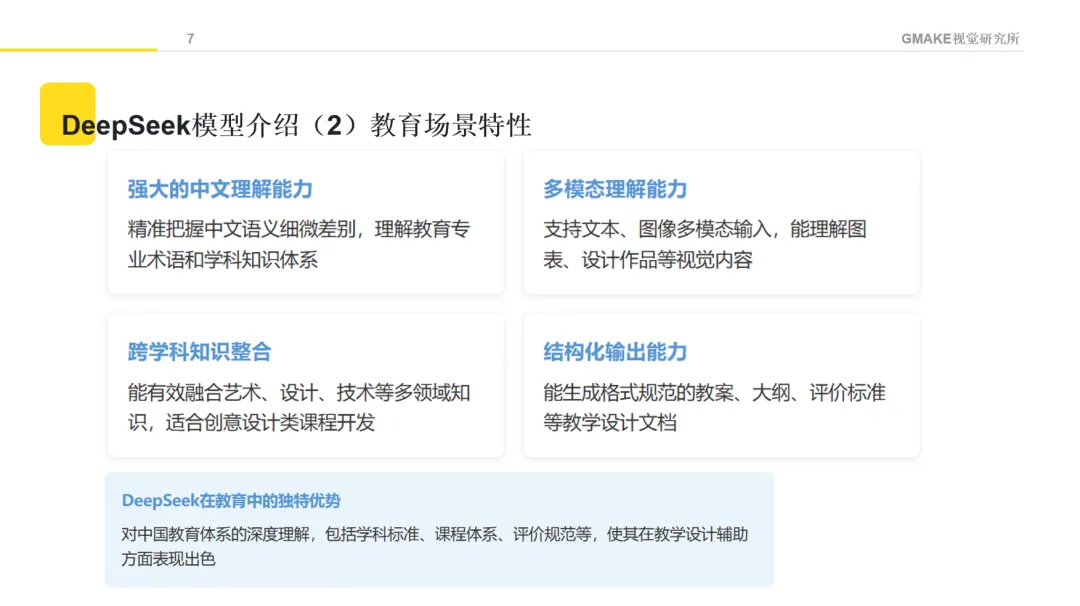 作为国内的大语言模型,DeepSeek在教育场景中有一些独特优势。它对中文教育语境有较好理解,对教学设计规范有一定把握,具备一定的跨学科知识融合能力,这使其在教学设计辅助方面可以提供一些帮助。在创意设计教育这类需要技术与艺术融合的领域,DeepSeek可以尝试提供一些辅助支持。