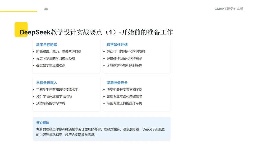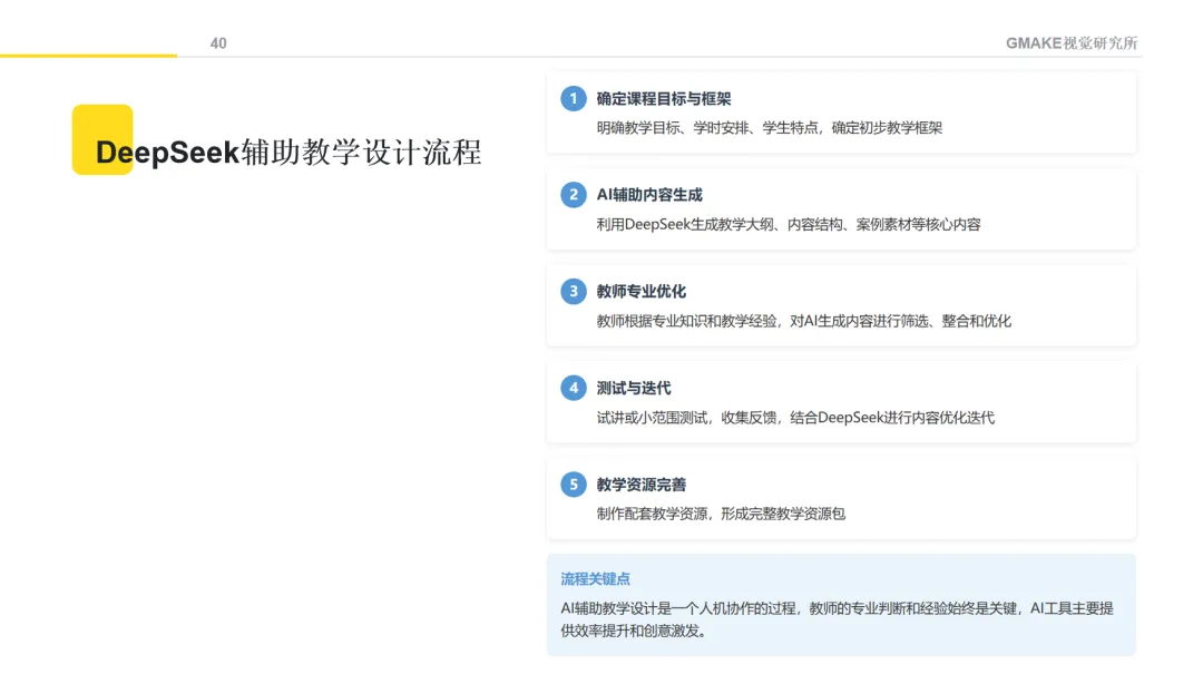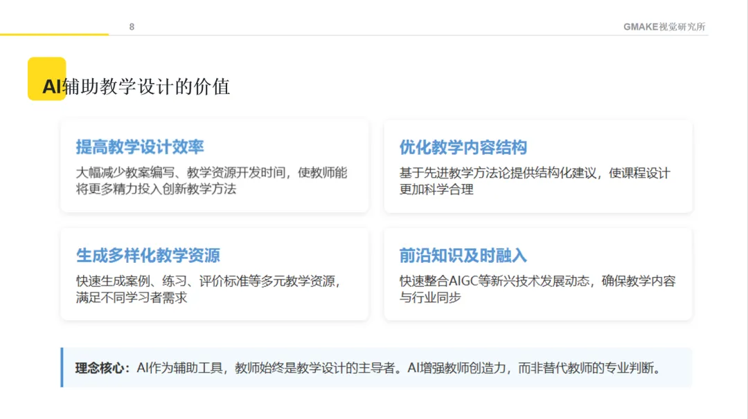 在教学内容开发环节,AI可以辅助生成一些基础素材,如教案框架、讲义草稿、案例素材和操作指南等。这些生成内容需要教师进行专业审核和修改,确保内容准确、适合学生特点并符合教学目标。