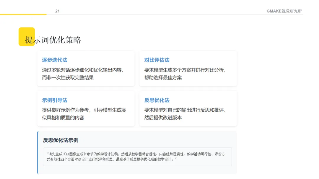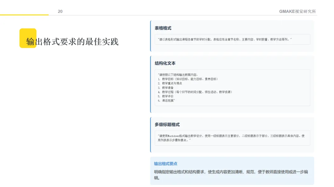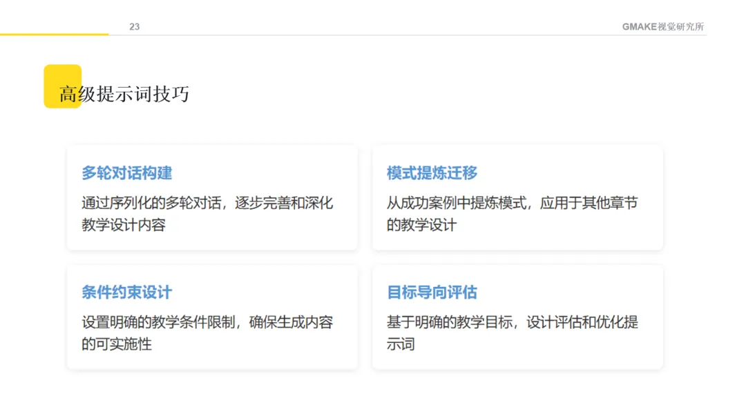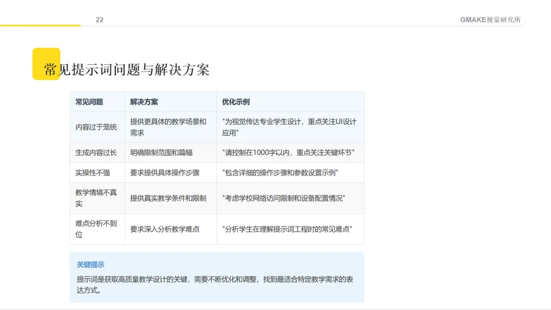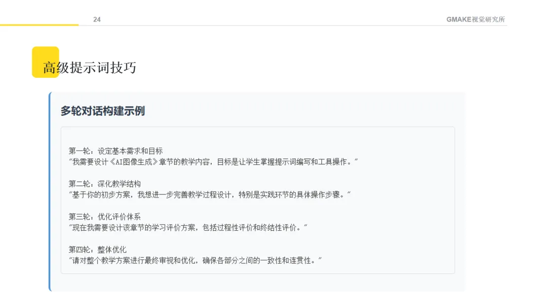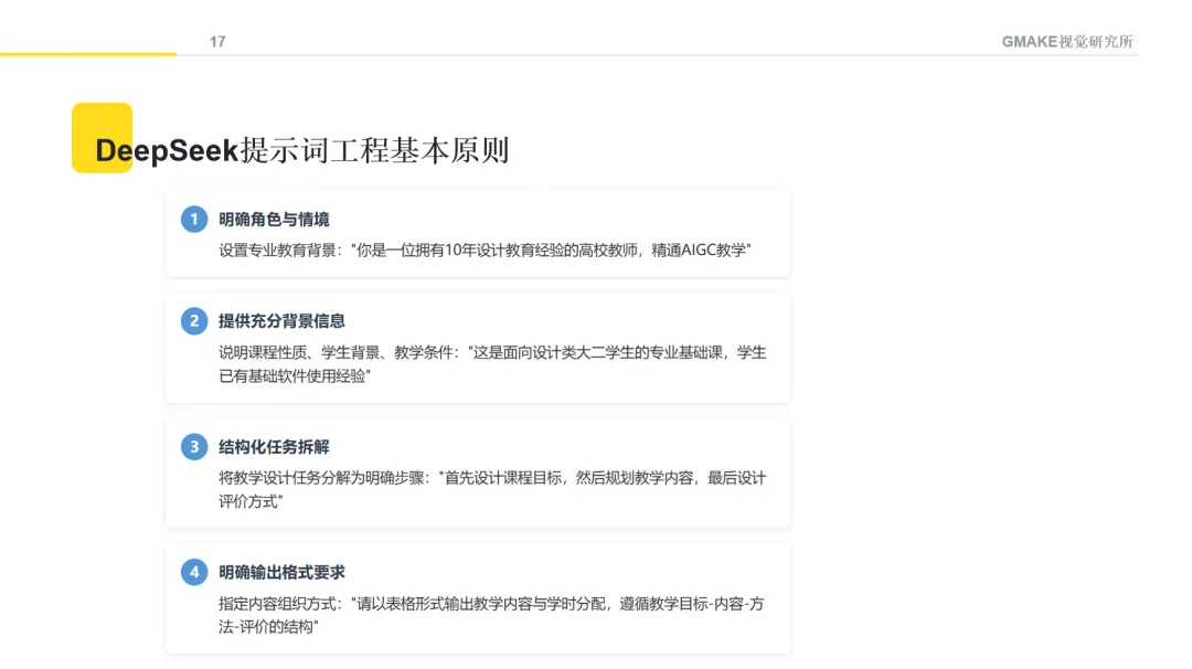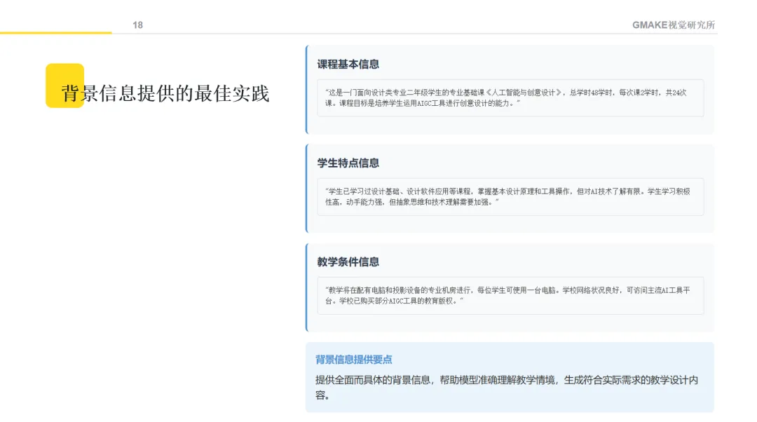 向AI提供明确的角色定位和情境描述,能够帮助获得更符合教育专业语境的内容。例如,可以设定"请以教育设计专家的角色,帮助我设计一门关于AI创意设计的课程",并提供课程背景信息。