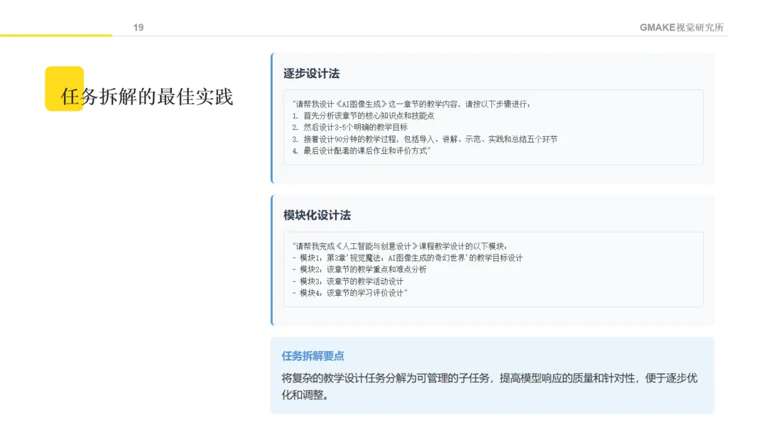 将教学设计任务分解为明确步骤,可以帮助AI更好地理解需求。例如,可以按照"分析知识点-设计教学目标-规划教学过程-设计评价方式"的顺序提出要求。