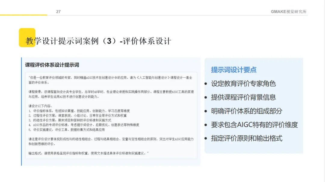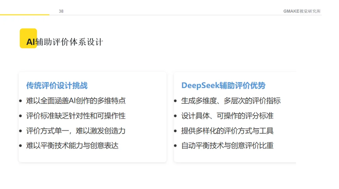 对于《人工智能与创意设计》这样结合技术与艺术的课程,评价设计相对复杂。AI可以帮助构思一些可能的评价维度,如创意构思、技术应用、艺术表现等,为教师提供参考。最终的评价方案仍需教师根据教学实际情况进行专业判断和设计。