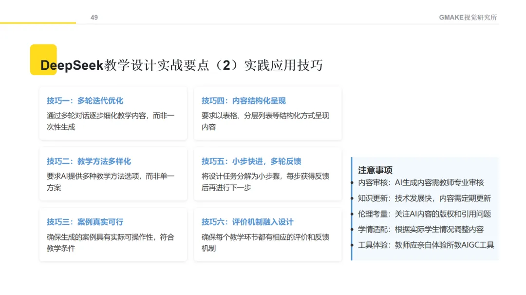 在使用AI辅助教学设计时,有几点技巧值得注意:采用多轮迭代方式逐步完善内容;尝试获取多样化的教学方法建议;确保生成内容与实际教学条件相符;注重内容的实用性和可行性。