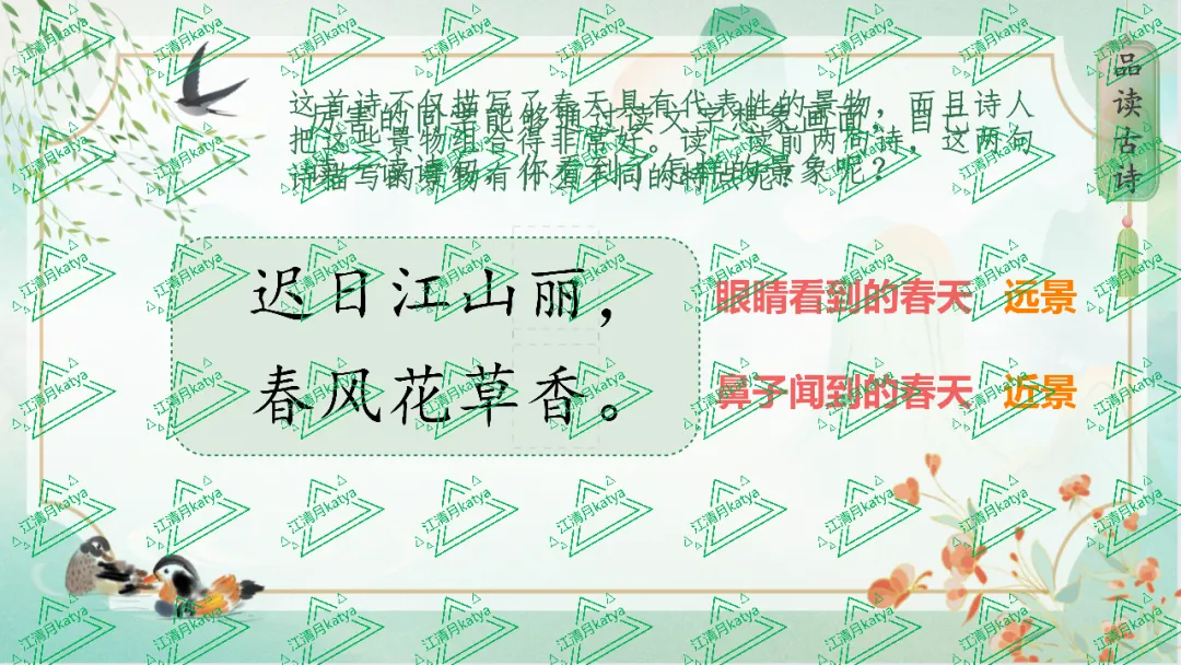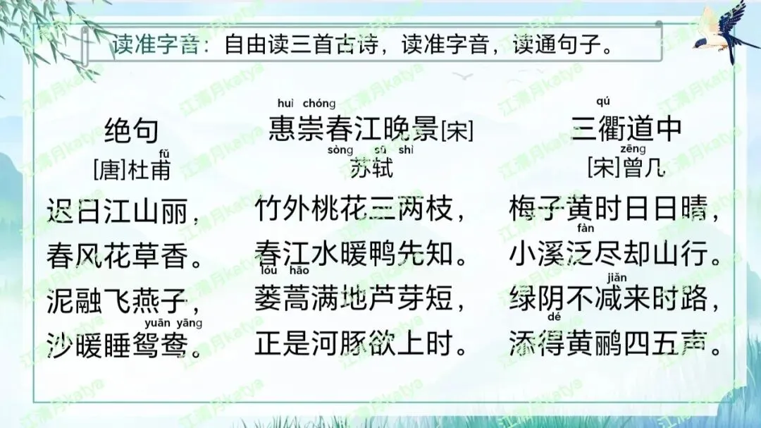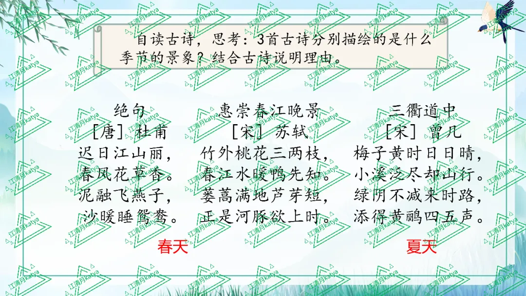 《绝句》《惠崇春江晚景》《三衢道中》 之前听何捷老师的课,说《古诗三首》应该连在一起教,当时一语道醒梦中人,但是自己实践却总是差点意思。到了三上的《古诗三首》一下悟了,这样对比也能让学生更好理解三首古诗的内涵。