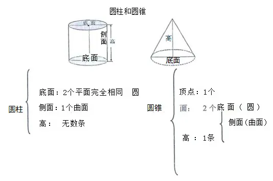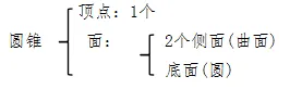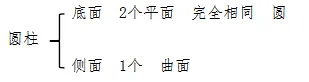 预设1:圆柱的上下两个面是大小相同的圆,侧面是一个曲面。圆锥的底面是一个圆,侧面是一个曲面。