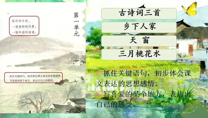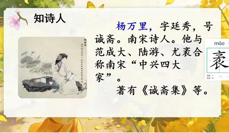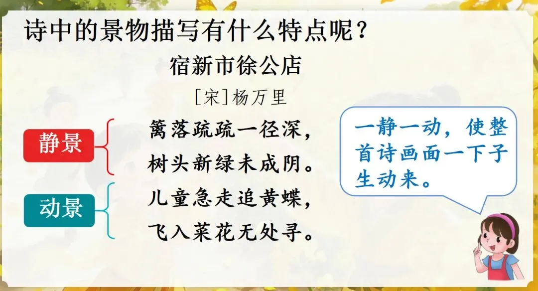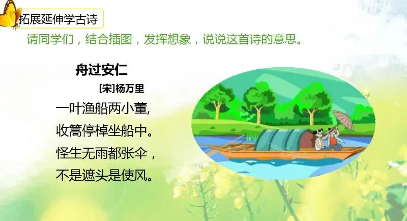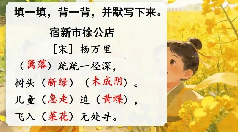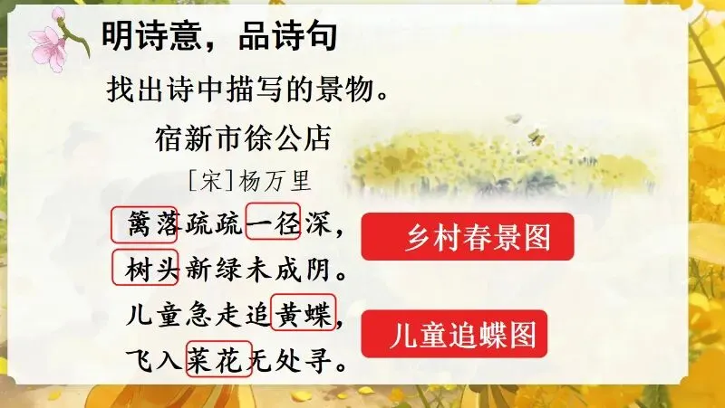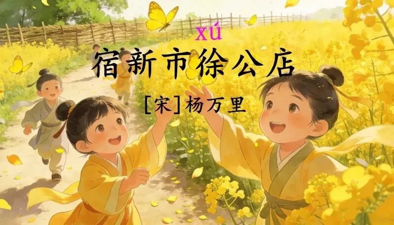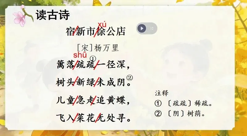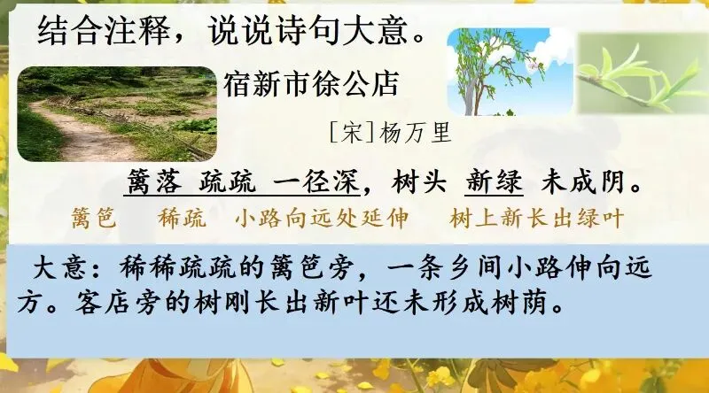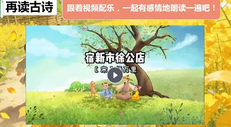 这几天太忙了,但还是要抽空准备教学课件,今晚终于完成了第一课两首古诗的备课,以下分享《宿新市徐公店》部分课件: