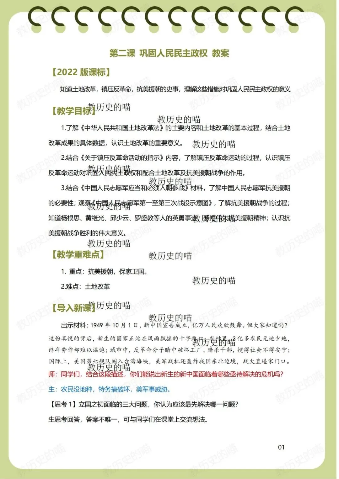 宝子们!八下历史第二课《巩固人民民主政权》完整教案来啦✅紧扣 2022 课标,以「新生政权的危机与应对」为主线,把土地改革、镇压反革命、抗美援朝三大知识点串联,逻辑超清晰,课堂好落地!