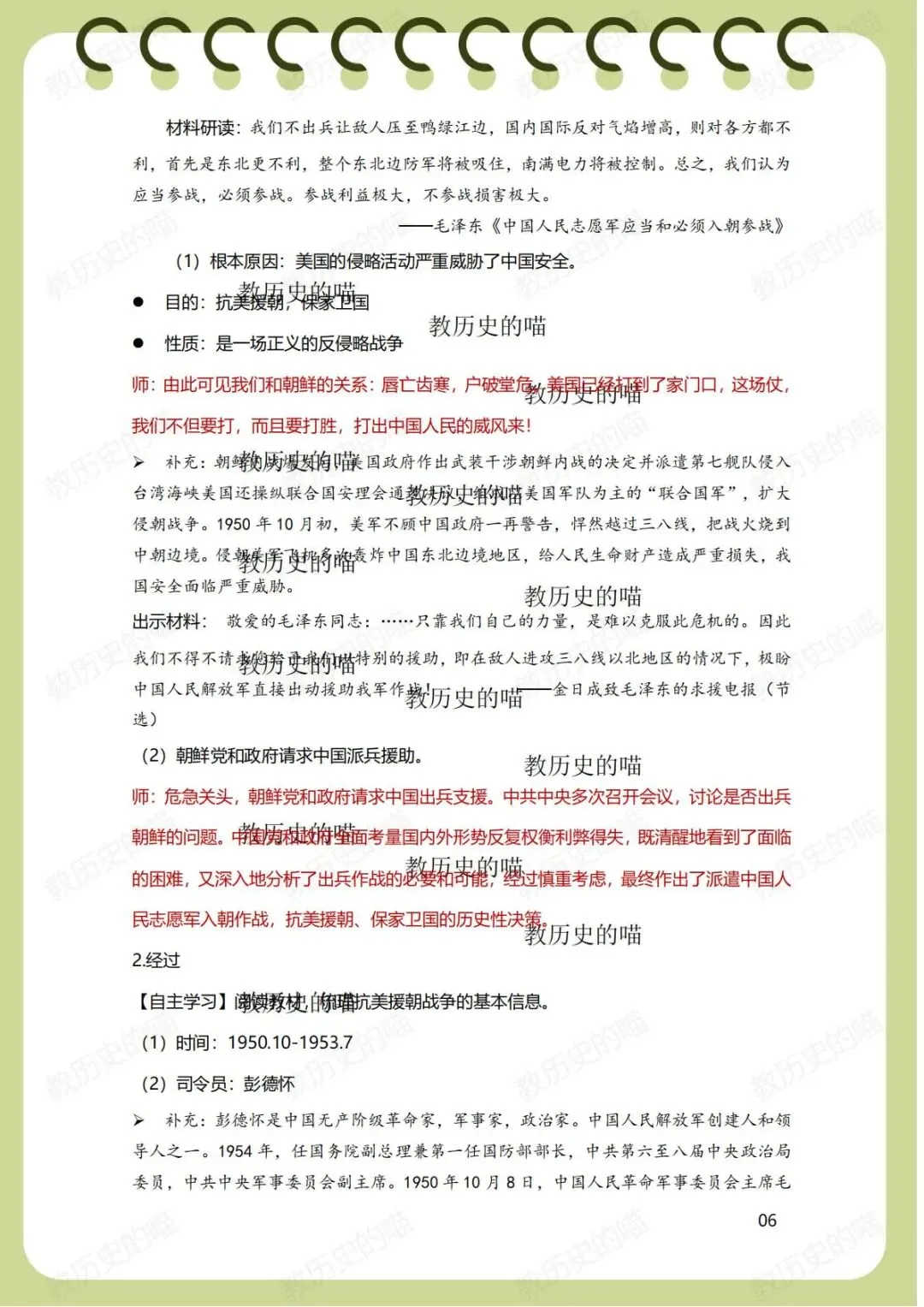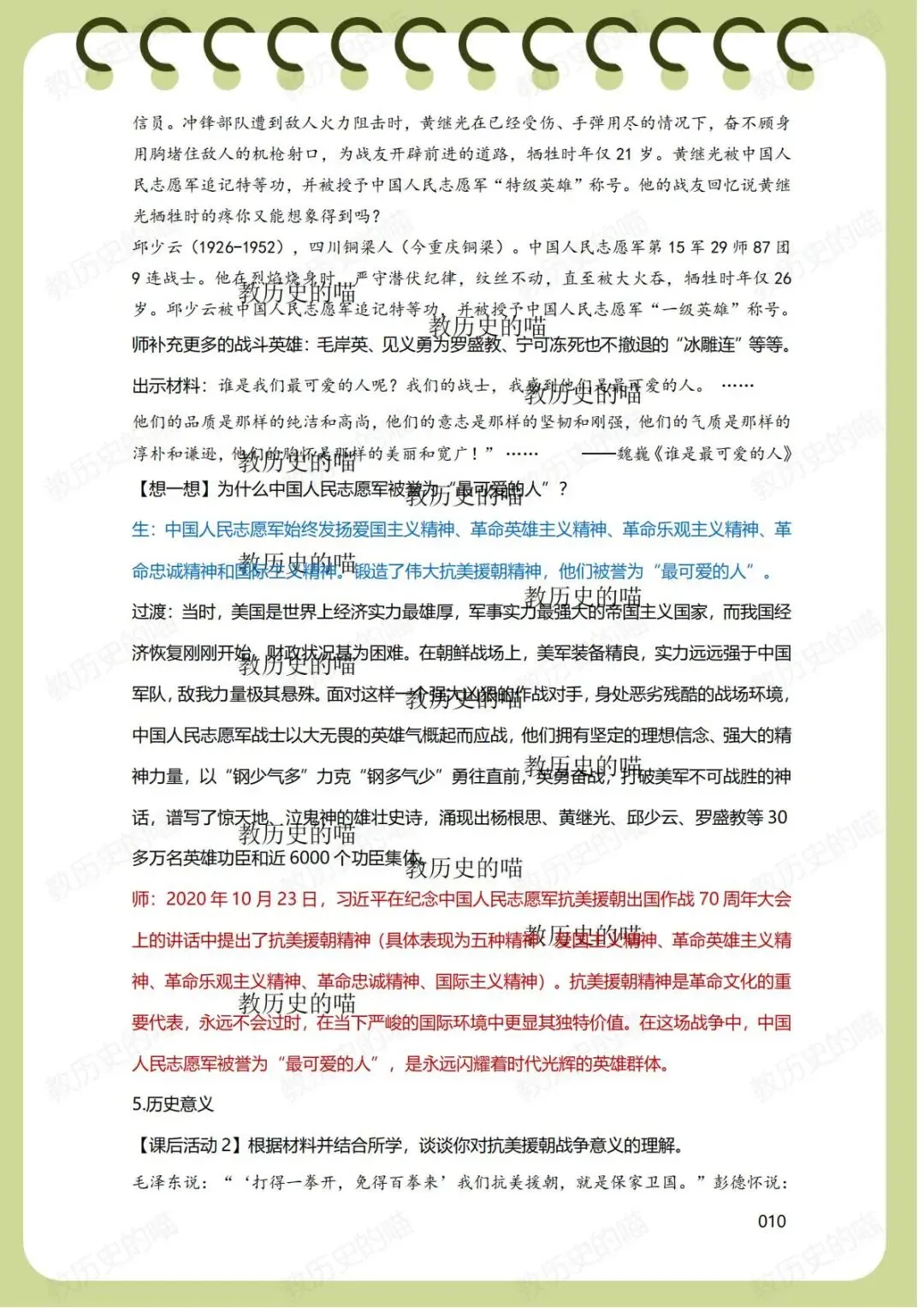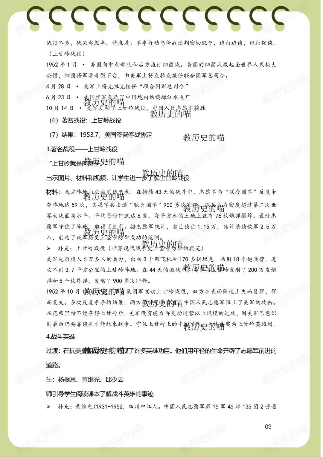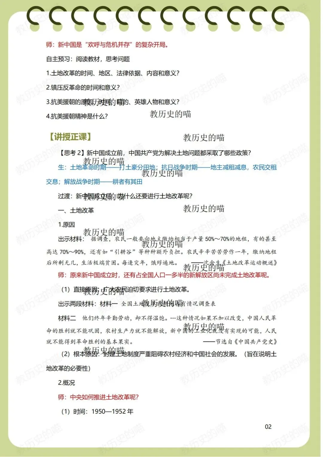 课堂设计超用心:✅史料超丰富:数据、文献、地图、视频全配齐,层层设问落实史料实证素养✅重精神引领:深挖黄继光、杨根思、冰雕连等英雄事迹,吃透抗美援朝精神✅破教学难点:针对土地改革「私有制不变」易错点设计思考问题,重点超突出✅环节超完整:导入→正课→小结→板书→反思,直接拎去上课,省时又省心
