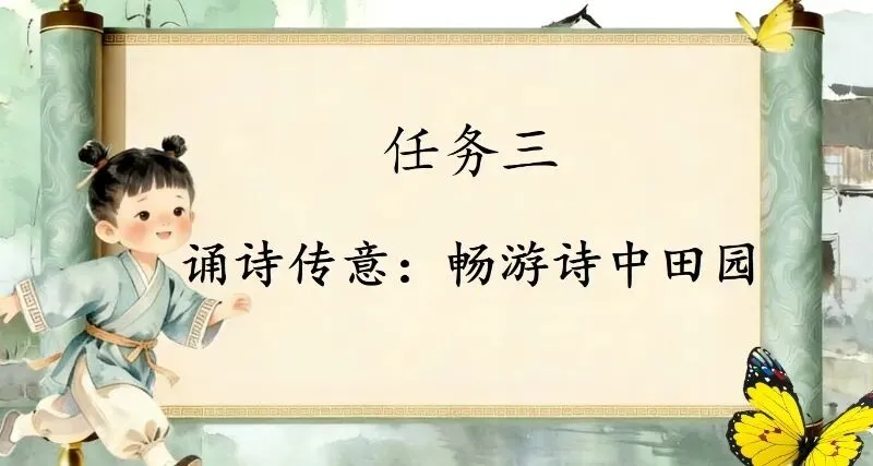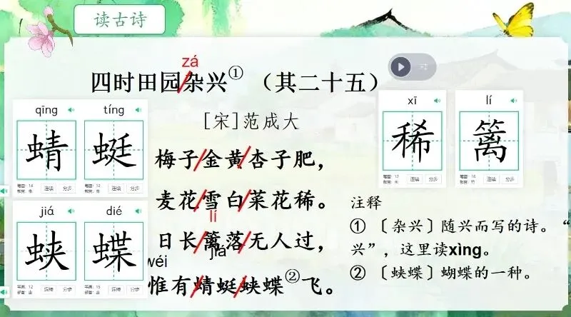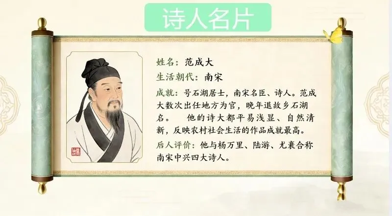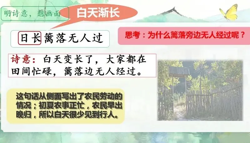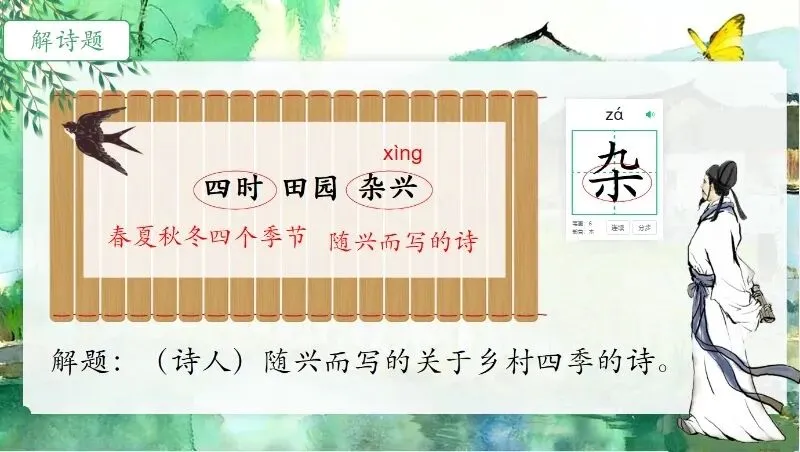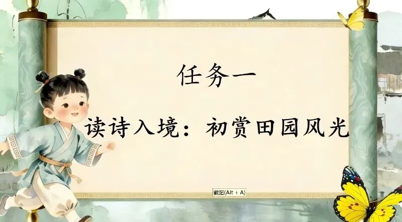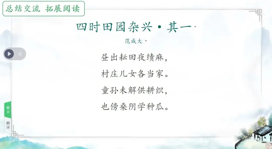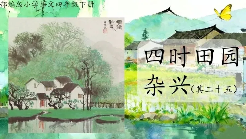 这几天太忙了,但还是要抽空准备教学课件,今晚终于完成了第一课两首古诗的备课,以下分享《四时田园杂兴(其二十五)》部分课件: