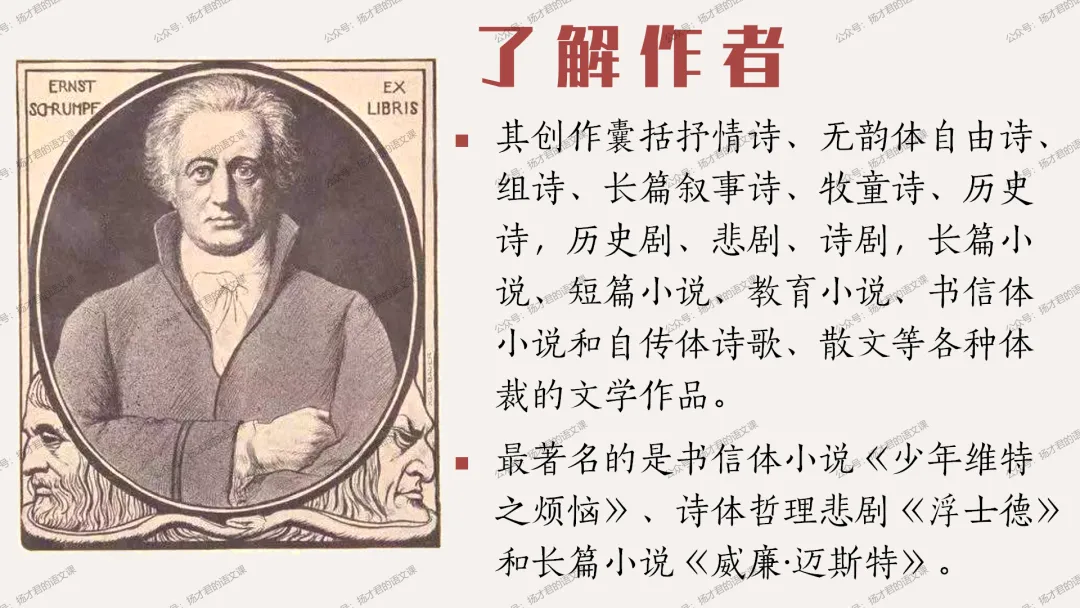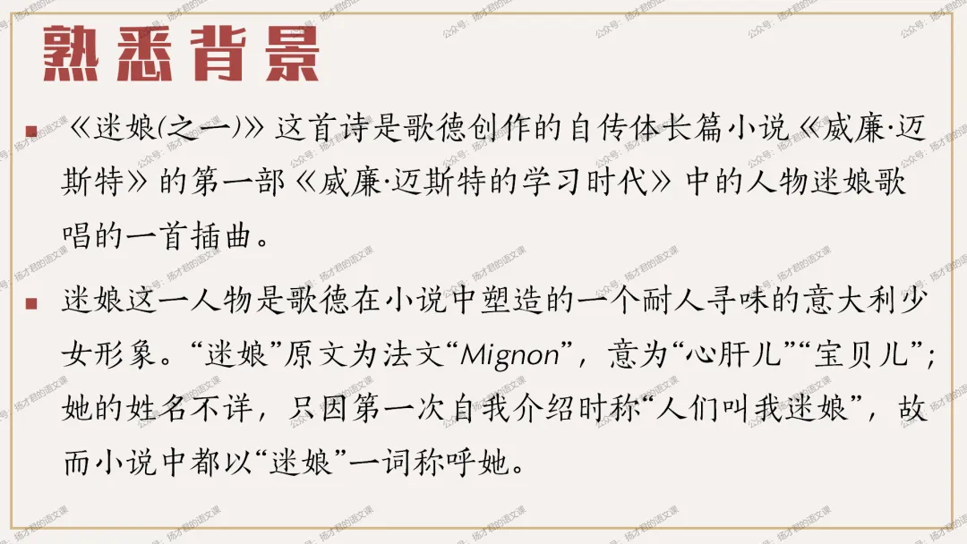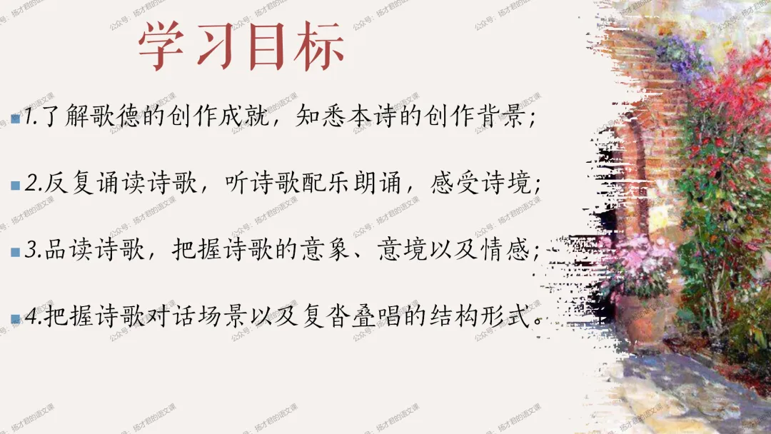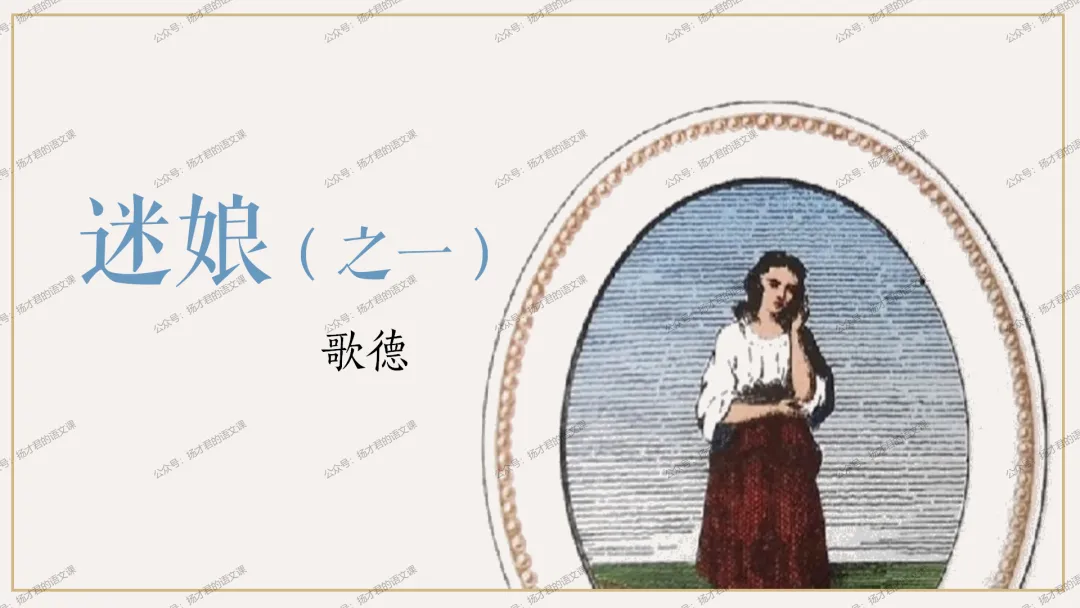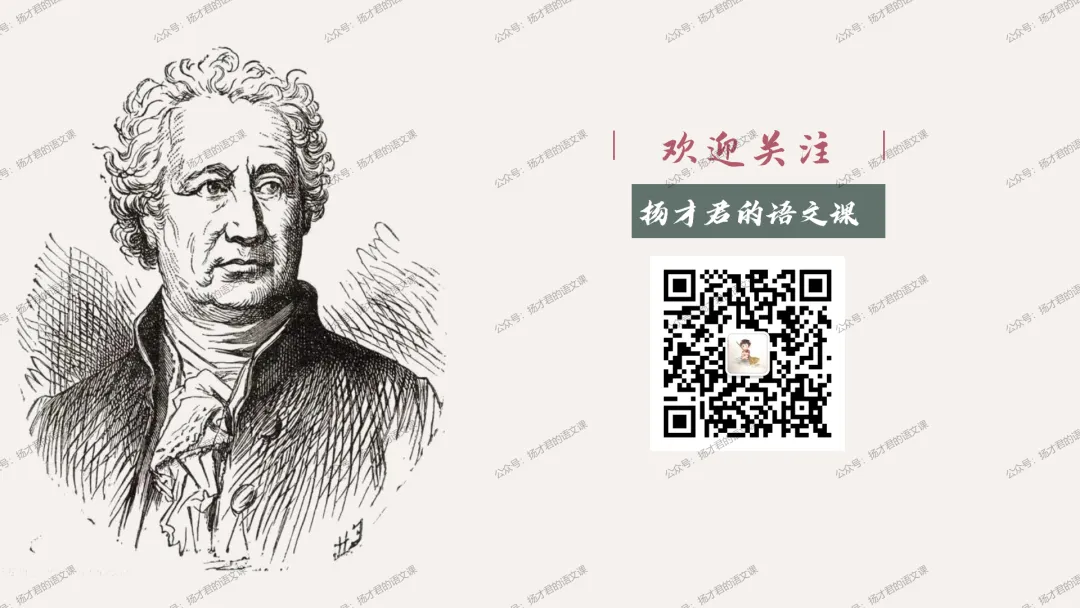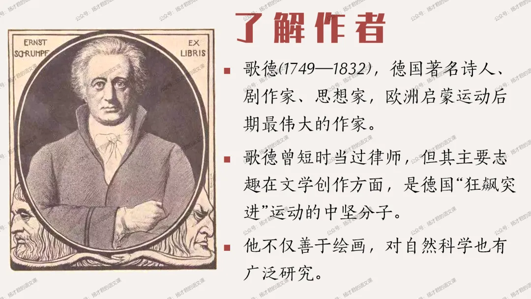 需要下载原创课件使用的老师,请直接长按下方二维码添加一个扬才君的小助手的微信,付费就可以获得下载码啦。(之前加过其他微信号的亲们,不用再加这个号了哦)下载码会在24小时内回复。多谢大家的支持!目前扬才君已经出完统编版五本书原创课件1.0版本的合集:统编版必修上,必修下,选必上,选必中,选必下。需要的老师,欢迎点击下面的链接查看哦~每一个课件都是精心设计,审美一流的,欢迎大家围观~2024-2025学年主要把高一必修上和必修下的课件进行2.0版本的更新,今年秋季学期开始,开始对选择性必修上中下的课件进行更新,温馨提示:2.0版本只是在1.0版本的基础上进行微调和补充,如果来不及等更新的亲们,之前1.0版本的课件,完全可以用哦。之前的课件质量很不错的。今天跟诸位老师分享的课件是选必中2.0版《迷娘(之一)》原创课件(附教学设计)。更新的课件,思路清晰,内容充实,设计精美,希望对大家有用哦!本课件设计学习目标如下:1.了解歌德的创作成就,知悉本诗的创作背景;