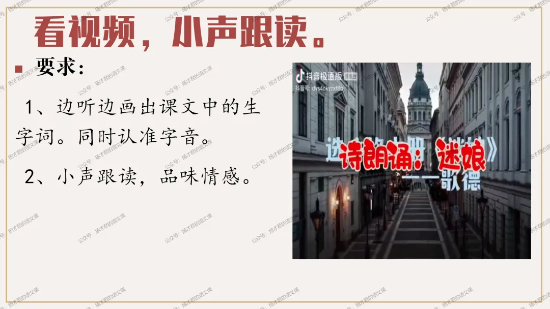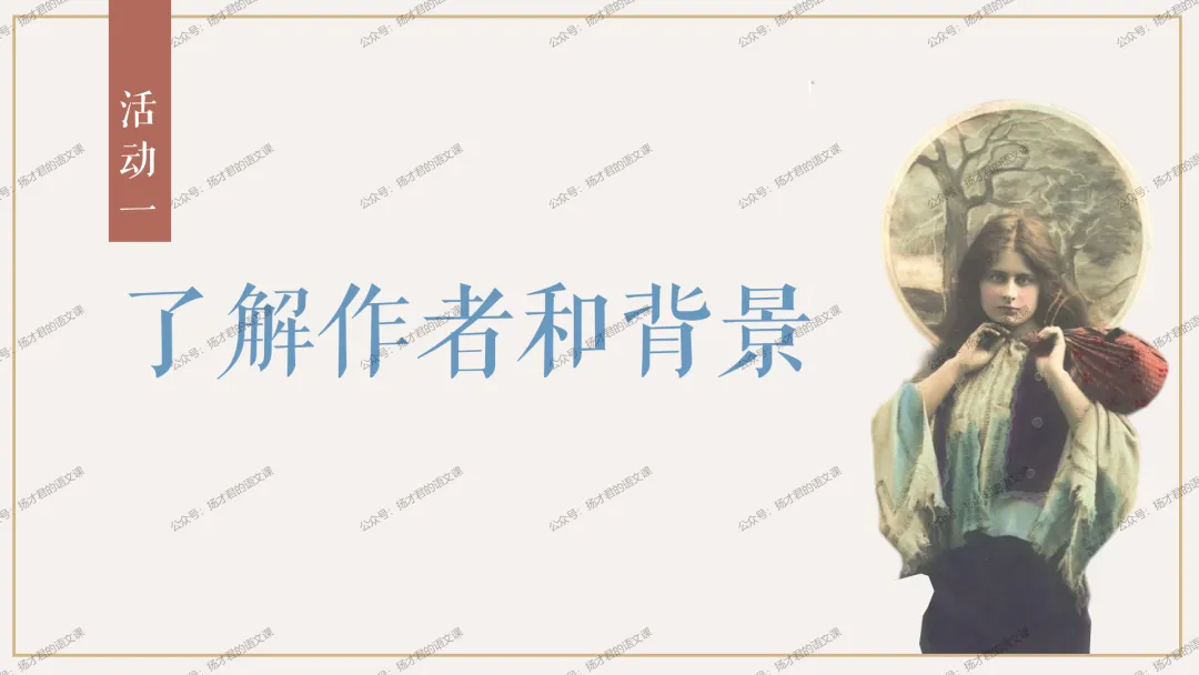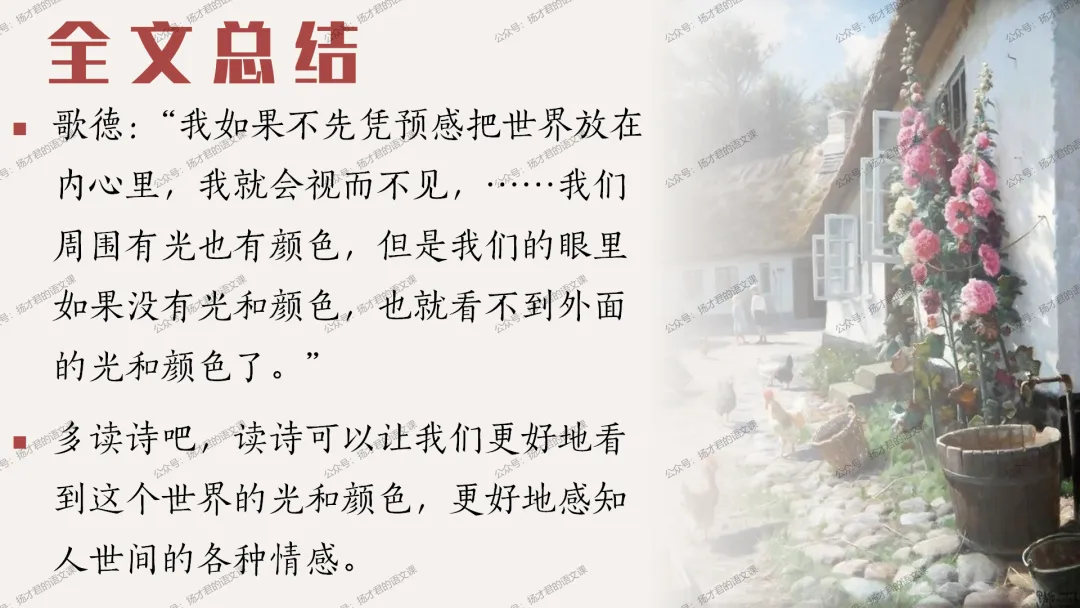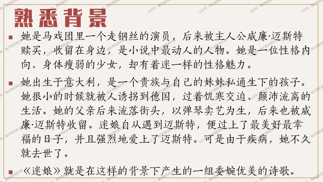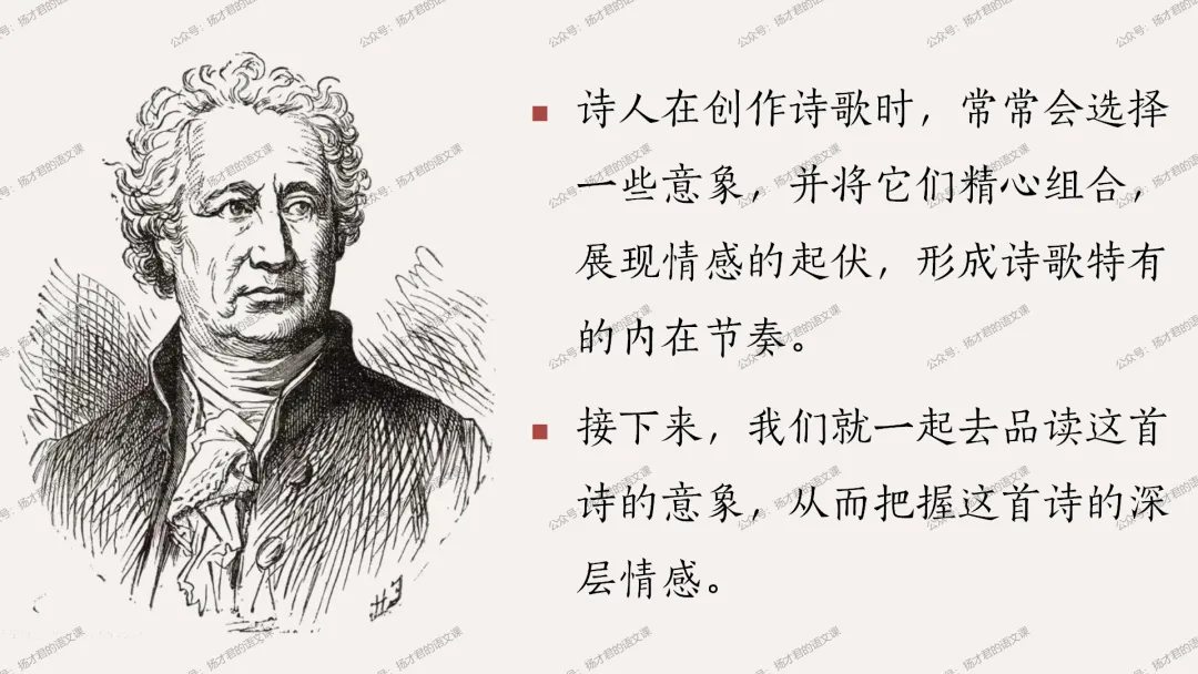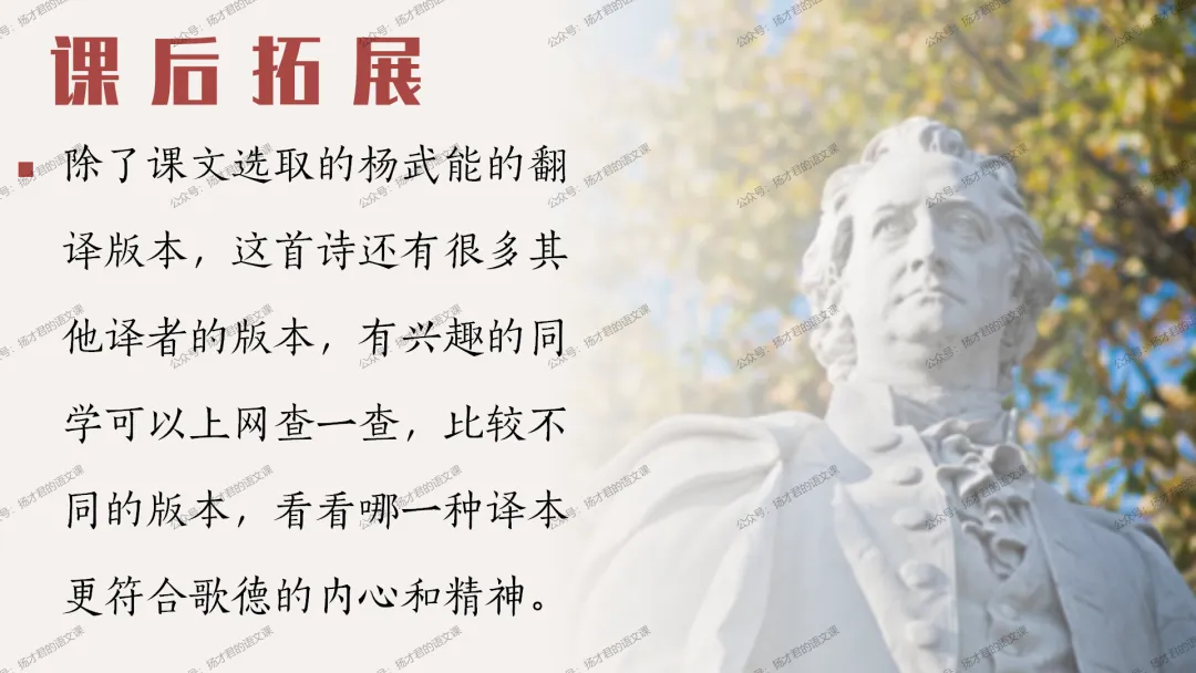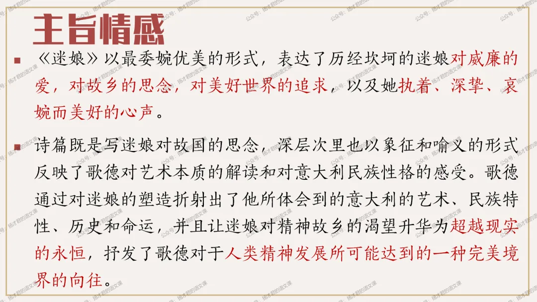 需要下载原创课件使用的老师,请直接长按下方二维码添加一个扬才君的小助手的微信,付费就可以获得下载码啦。(之前加过其他微信号的亲们,不用再加这个号了哦)下载码会在24小时内回复。多谢大家的支持!目前扬才君已经出完统编版五本书原创课件1.0版本的合集:统编版必修上,必修下,选必上,选必中,选必下。需要的老师,欢迎点击下面的链接查看哦~每一个课件都是精心设计,审美一流的,欢迎大家围观~2024-2025学年主要把高一必修上和必修下的课件进行2.0版本的更新,今年秋季学期开始,开始对选择性必修上中下的课件进行更新,温馨提示:2.0版本只是在1.0版本的基础上进行微调和补充,如果来不及等更新的亲们,之前1.0版本的课件,完全可以用哦。之前的课件质量很不错的。今天跟诸位老师分享的课件是选必中2.0版《迷娘(之一)》原创课件(附教学设计)。更新的课件,思路清晰,内容充实,设计精美,希望对大家有用哦!本课件设计学习目标如下:1.了解歌德的创作成就,知悉本诗的创作背景;