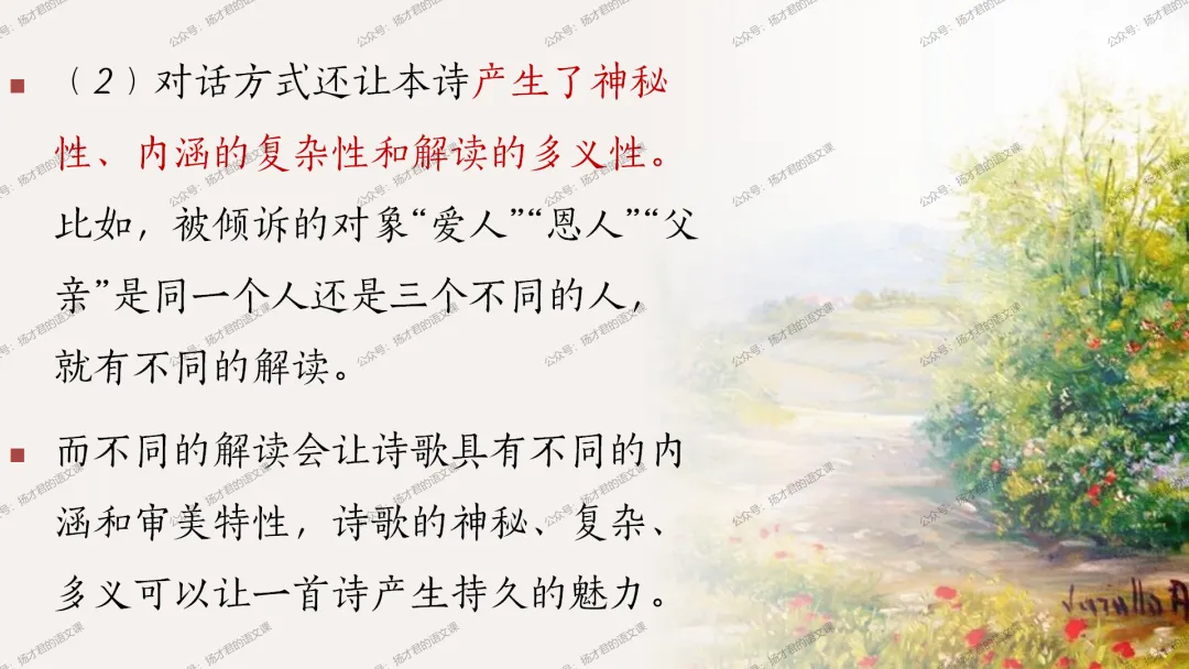课件内容充实,从设计到打磨都花了很长时间,而且购买后课件logo可删,也可以自己编辑修改,喜欢的话,欢迎下载,多多交流;如果自己不是语文老师,也欢迎转发文章给身边那些美美的语文老师哦!感恩亲们的支持!下面是课件页面预览(本课件为原创付费课件,课件已申请版权保护,请大家尊重知识产权,切勿传播,侵权必究,感恩您的理解):课件配图源于网络,若无意侵犯了您的版权,请及时和我们联系,我们一定会妥善处理。由于课件是使用WPS制作的,所以大家最好用WPS打开哦。而且为了保证大家在教室的电脑也能够显示出字体和动画效果,所以PPT嵌入了一些字体,大家下载打开的时候,多一些耐心哈。需要必修上、必修下、选必上、选必中和选必下五本书课件合集的老师,点击下面图片可跳往查看哦:需要下载原创课件使用的老师,请直接长按下方二维码添加一个扬才君的小助手的微信,付费就可以获得下载码啦。(之前加过其他微信号的亲们,不用再加这个号了哦)下载码会在24小时内回复。多谢大家的支持!喜欢公众号的话,欢迎点亮在看,欢迎把公众号的文章转发到朋友圈,转发语文群,让更多的语文人知道我们。真心感激不尽!