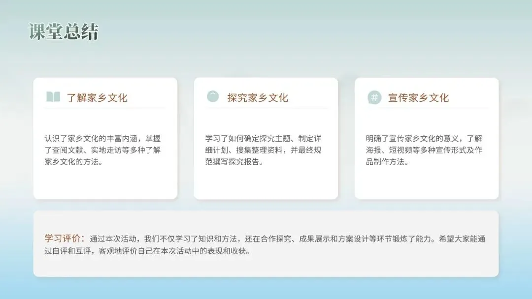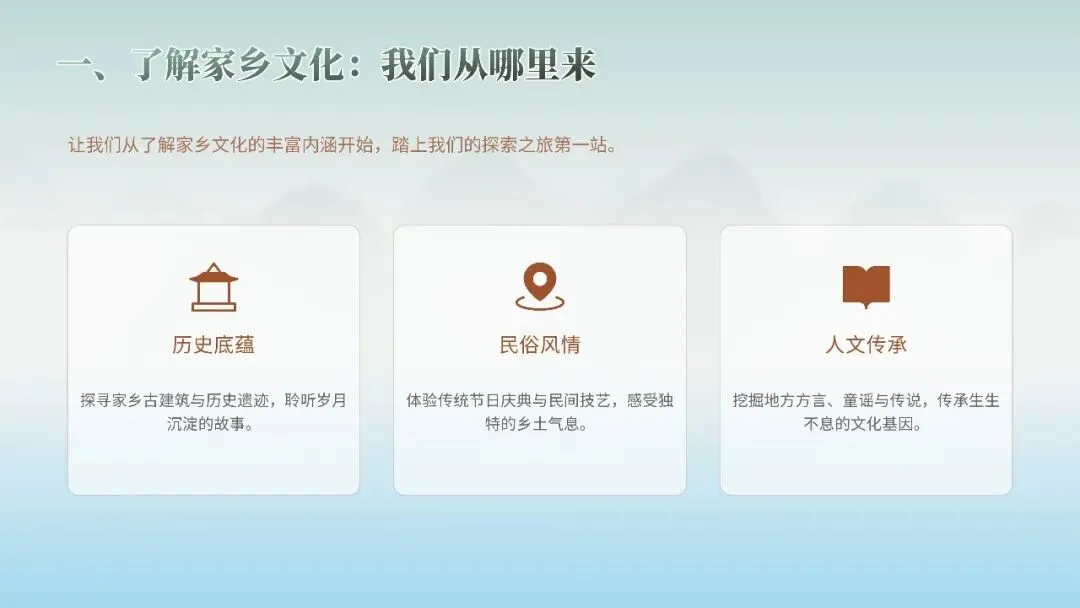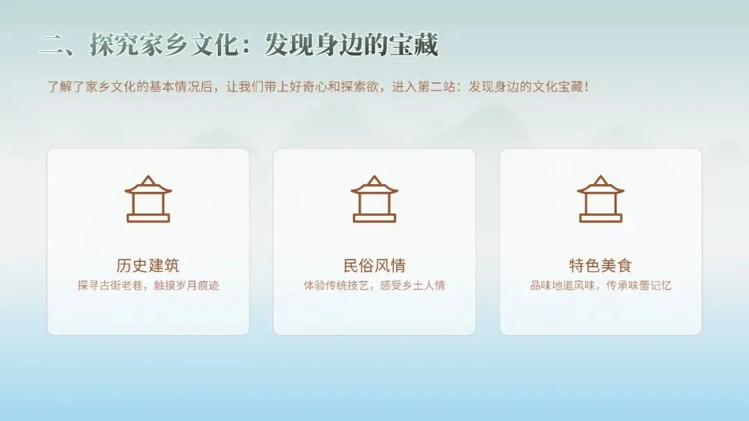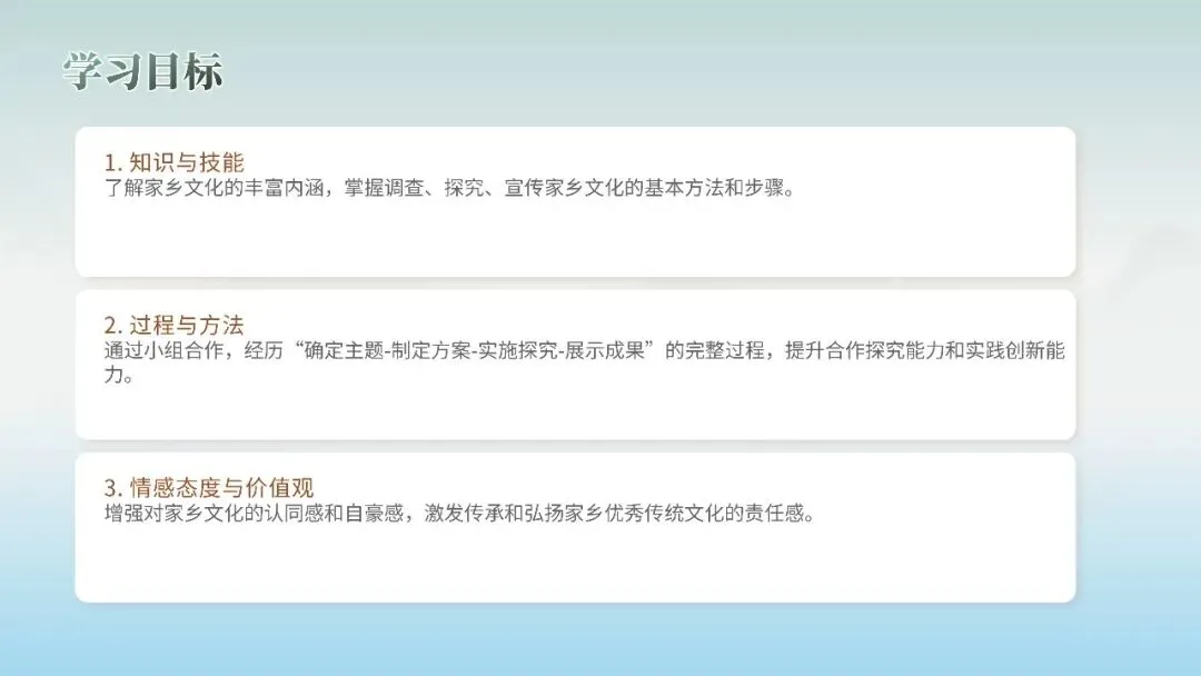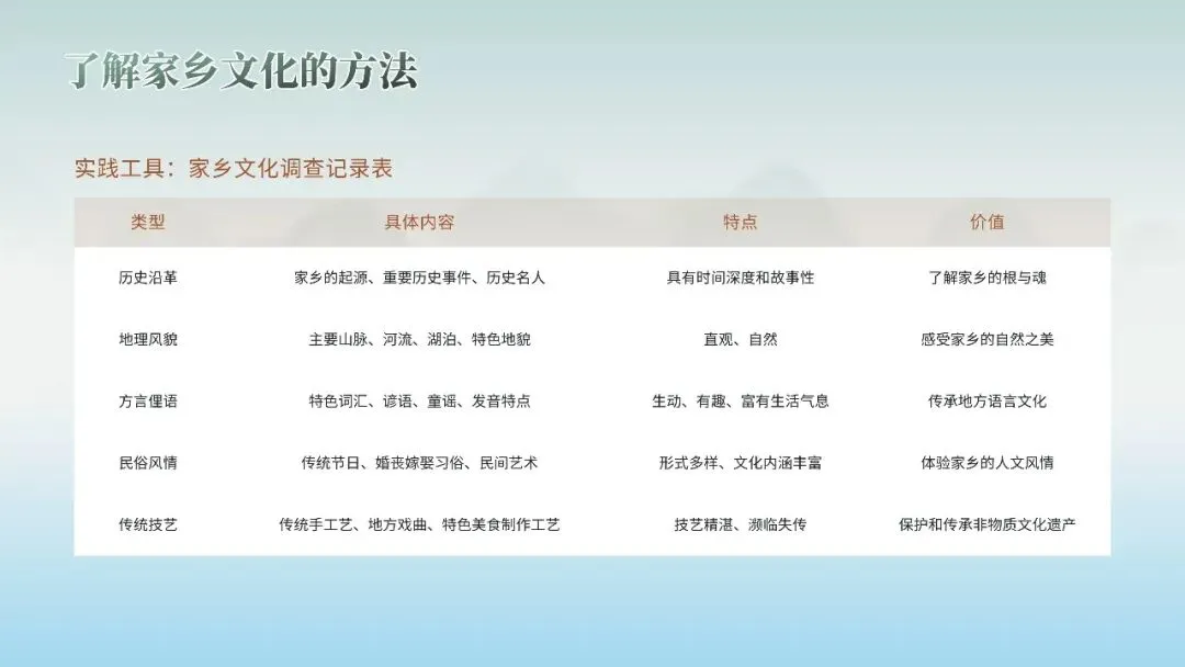 本单元旨在以"了解—探究—宣传"为主线,引导学生从走进家乡、探寻文化根脉建立认同,到深度剖析文化现象、解读时代价值培养能力,再到掌握传播技巧、讲好家乡故事担当责任,构建完整的家乡文化学习闭环,培育兼具文化自觉与传播能力的青年传承者。