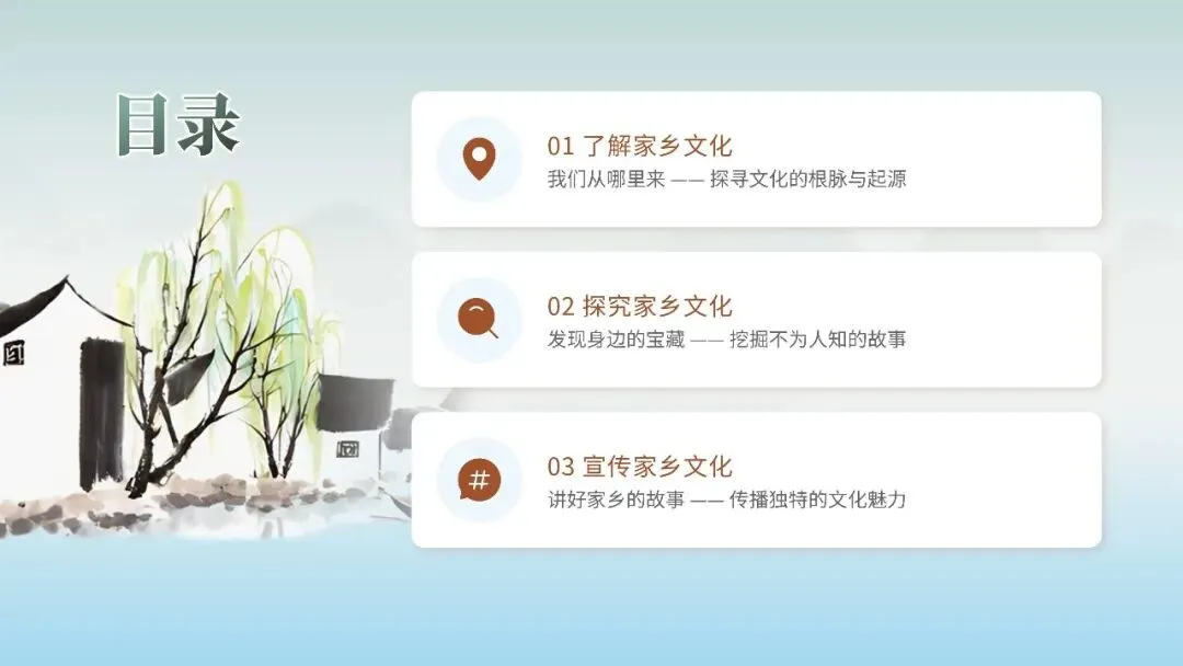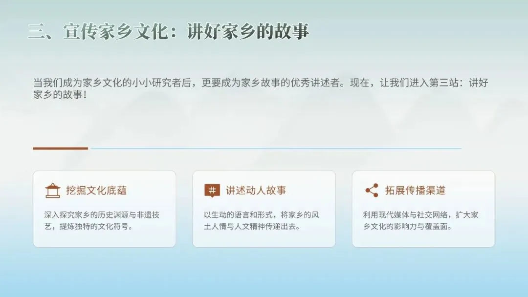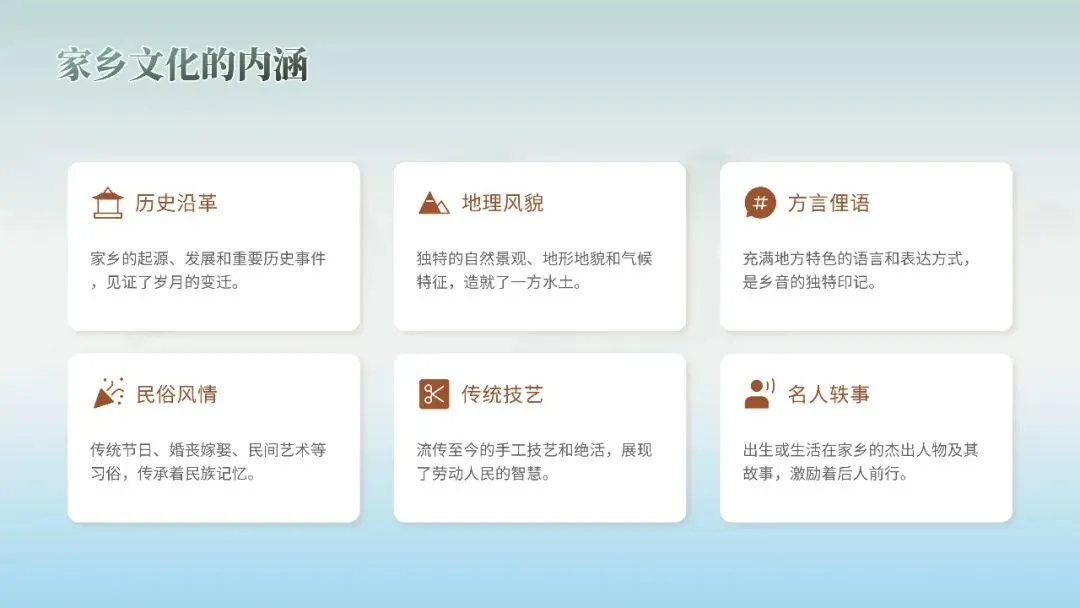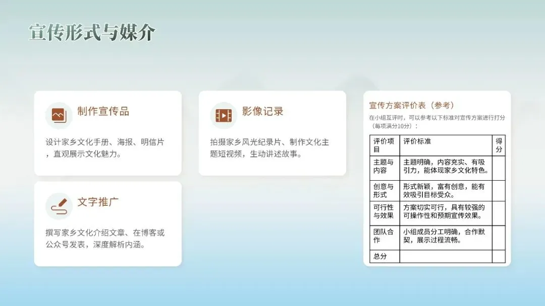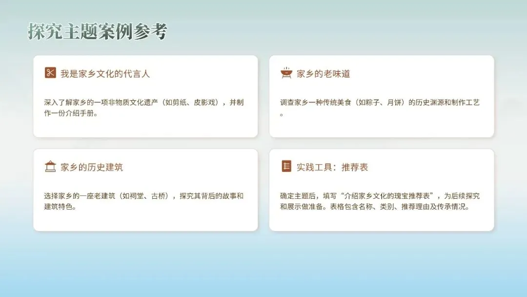 本单元旨在以"了解—探究—宣传"为主线,引导学生从走进家乡、探寻文化根脉建立认同,到深度剖析文化现象、解读时代价值培养能力,再到掌握传播技巧、讲好家乡故事担当责任,构建完整的家乡文化学习闭环,培育兼具文化自觉与传播能力的青年传承者。