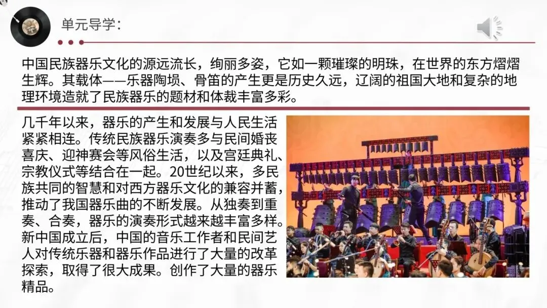 本期更新的课件为统编高教社版中职《艺术(音乐鉴赏与实践)》第五单元 中国民族器乐,共72页。