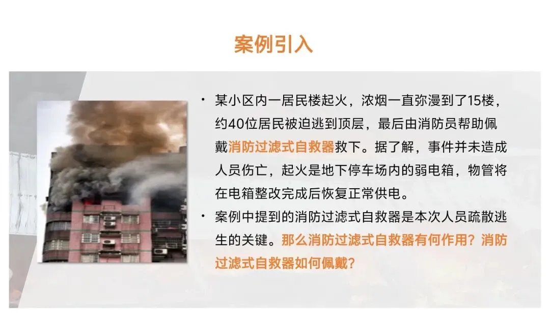 火灾事故中,真正夺走生命的往往不是明火,而是浓烟与有毒有害气体。一氧化碳、氰化氢、氯化氢等有毒烟雾会在短时间内使人窒息、昏迷,让逃生者失去行动能力,而浓烟带来的视线遮挡,也会大幅增加疏散逃生的难度。此前某小区居民楼火灾事件中,40位居民因浓烟被困顶层,最终依靠消防过滤式自救呼吸器为消防员救援争取了时间,实现零伤亡,这一案例正是该器材重要性的真实印证。在火灾现场,每一秒都关乎生死,而过滤式自救呼吸器,就是为我们抢出逃生时间、隔绝致命威胁的关键屏障。