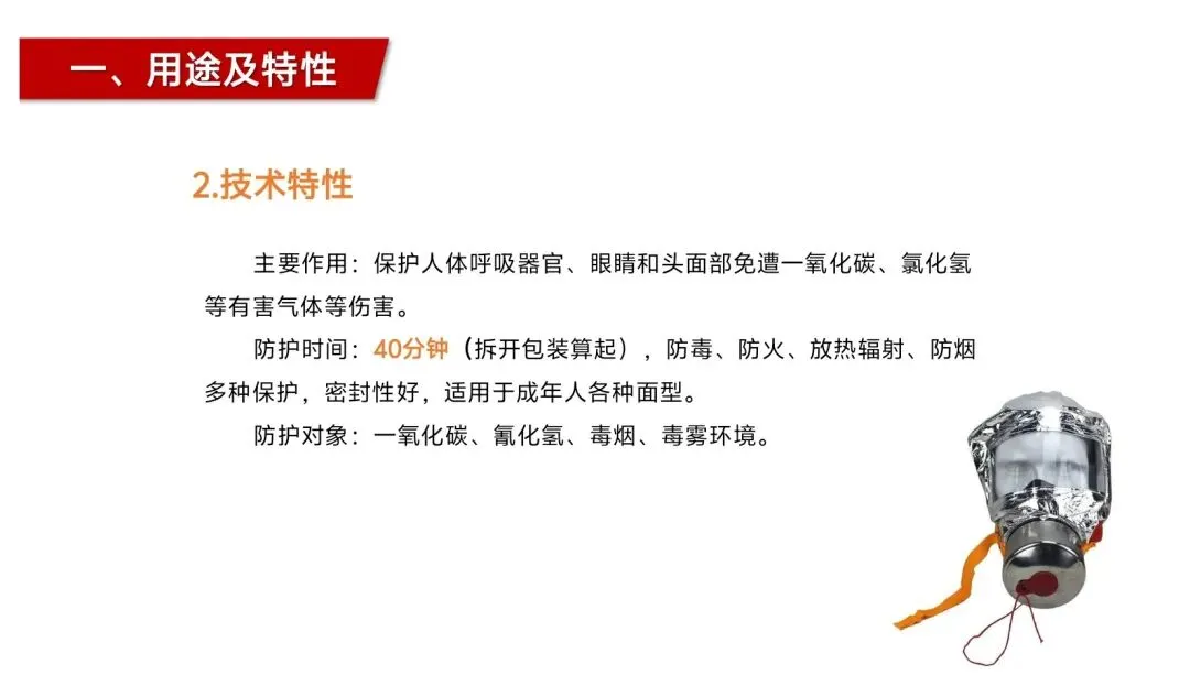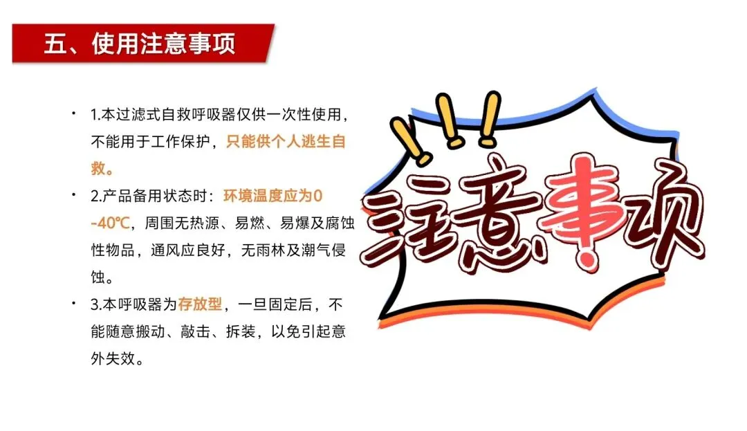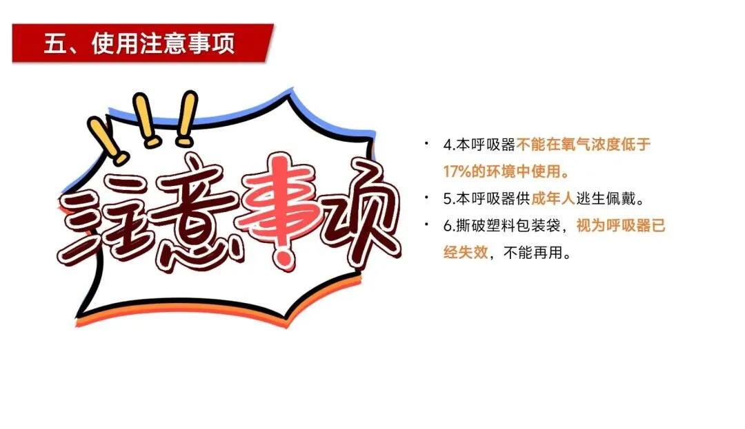 当然,作为一款保命的安全器材,其使用和存放的规范也决定了它能否在关键时刻发挥作用,这也是我想提醒广大消费者的重点。过滤式自救呼吸器是一次性使用器材,仅用于火灾逃生自救,不可作为工作保护用品;备用状态下需存放在0-40℃的环境中,远离热源、易燃易爆及腐蚀性物品,保持通风干燥,且固定存放后切勿随意搬动、敲击、拆装,避免器材失效;一旦撕破塑料包装袋,该呼吸器就视为失效,不可继续使用,同时它不能在氧气浓度低于17%的环境中使用,仅适用于成年人佩戴。这些注意事项看似繁琐,实则是保障器材有效性的关键,只有规范存放、正确使用,才能让它在危急时刻不掉链。