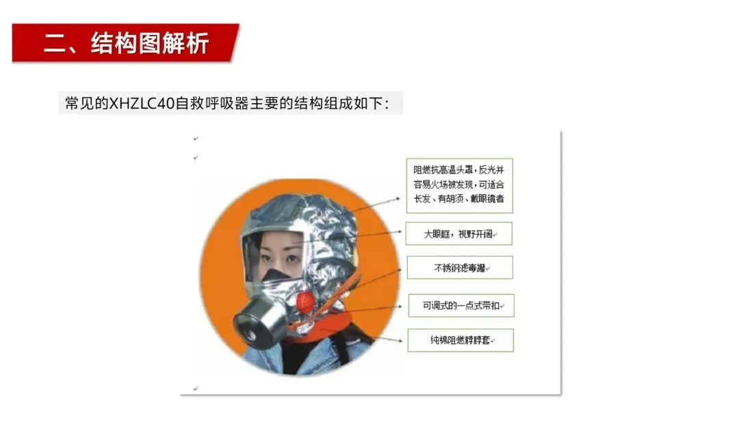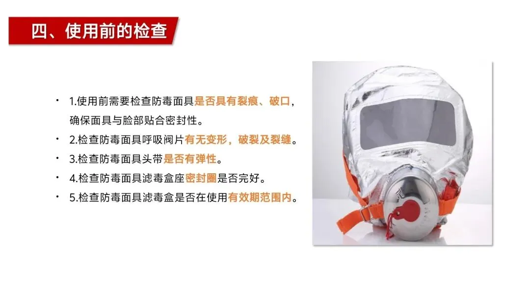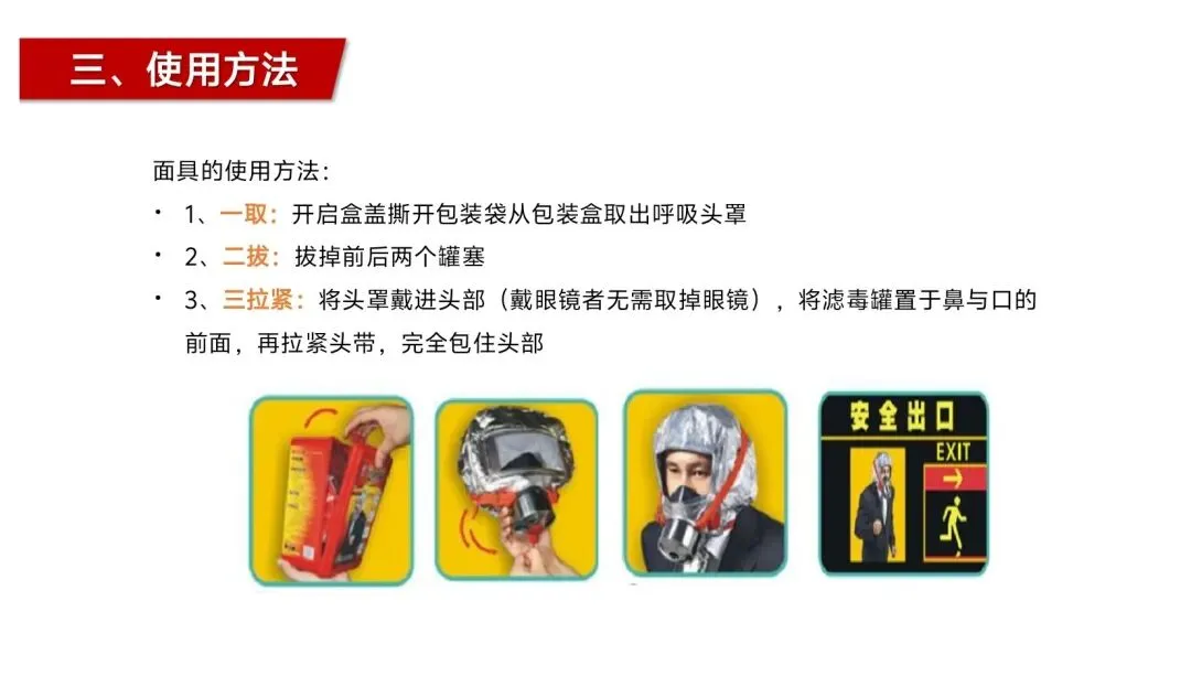 这款呼吸器的实用性,还体现在操作简单、易上手,无需专业培训,普通民众在紧急情况下也能快速使用。一取、二拔、三拉紧,三个简单步骤就能完成佩戴,戴眼镜者无需摘掉眼镜,长发、有胡须人群也能适配,大眼眶设计保证视野开阔,反光头罩还能让使用者在火场中更容易被救援人员发现,多重设计细节都贴合火场逃生的实际需求。同时,其在使用前的检查流程也清晰易懂,只需检查外观、呼吸阀片、头带弹性、密封圈及滤毒盒有效期,就能确保器材处于可用状态,即便没有消防知识基础,也能轻松完成自检。
