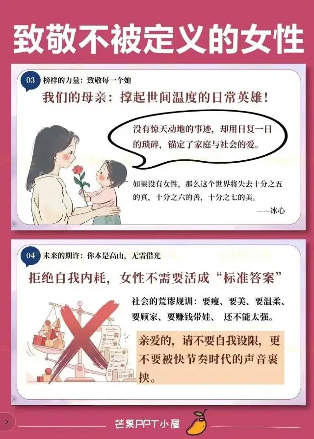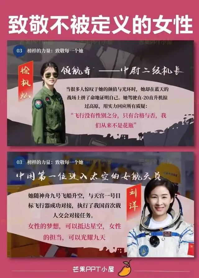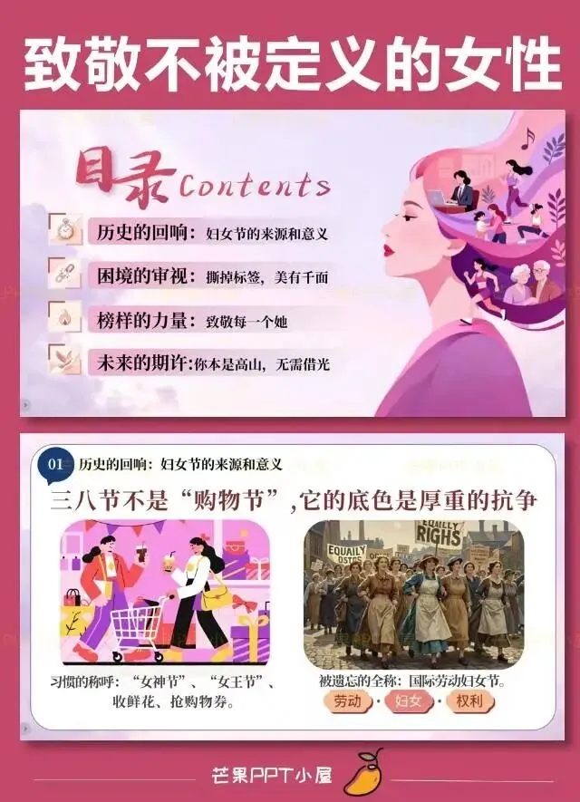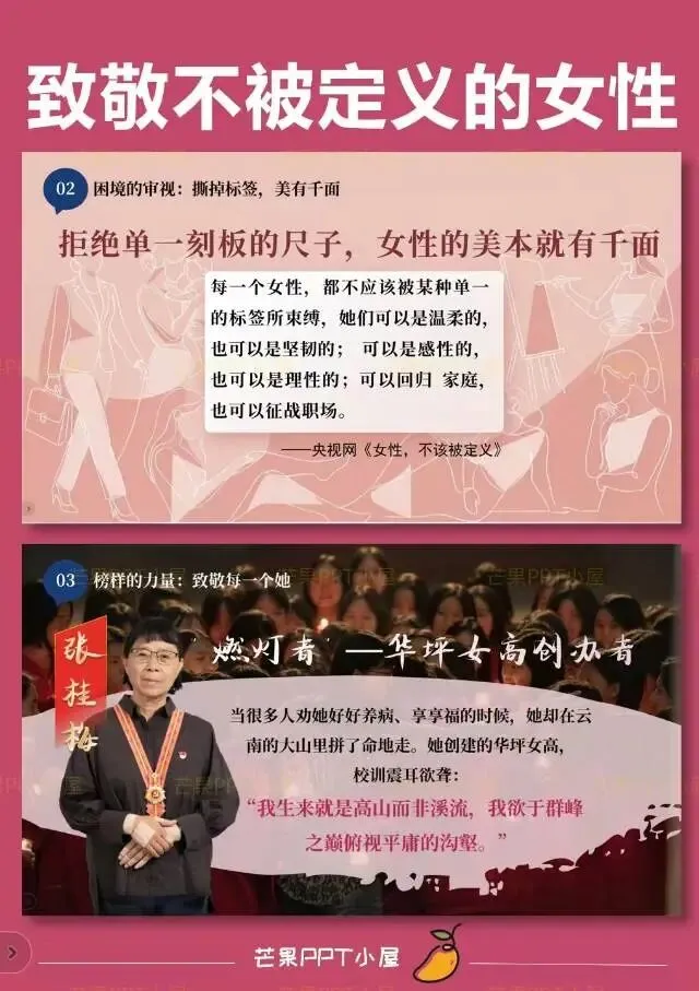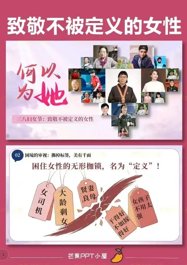 • 页数:ppt共21页• 内容素材:ppt内含一个两分钟的视频,有2400字发言稿!• 适用场景:三八妇女节,女性力量,女性权力,不被定义的女性,课前演讲,时事热点等等相关主题演讲~