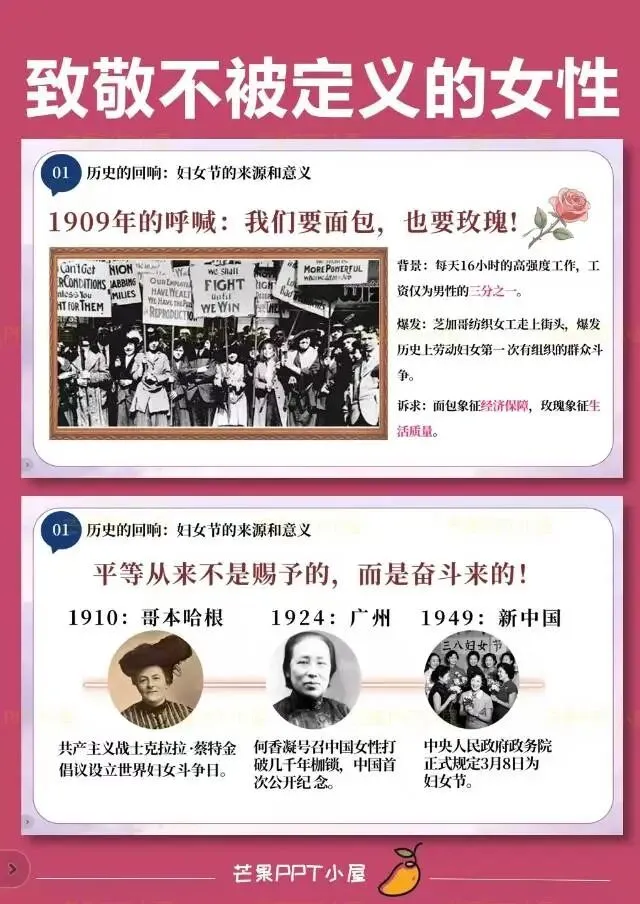 1909 年,美国芝加哥的女工为了争取权益走上街头;1924 年,中国妇女首次在广州公开纪念这一节日。