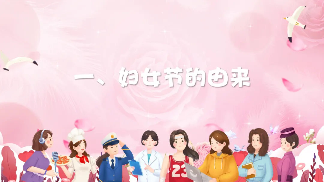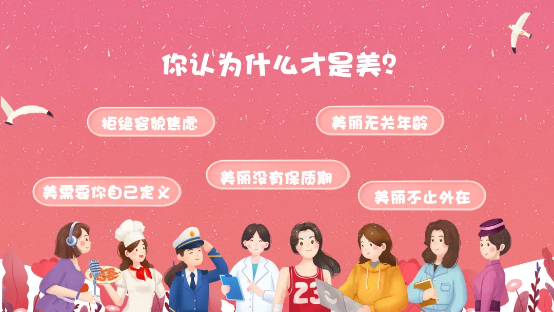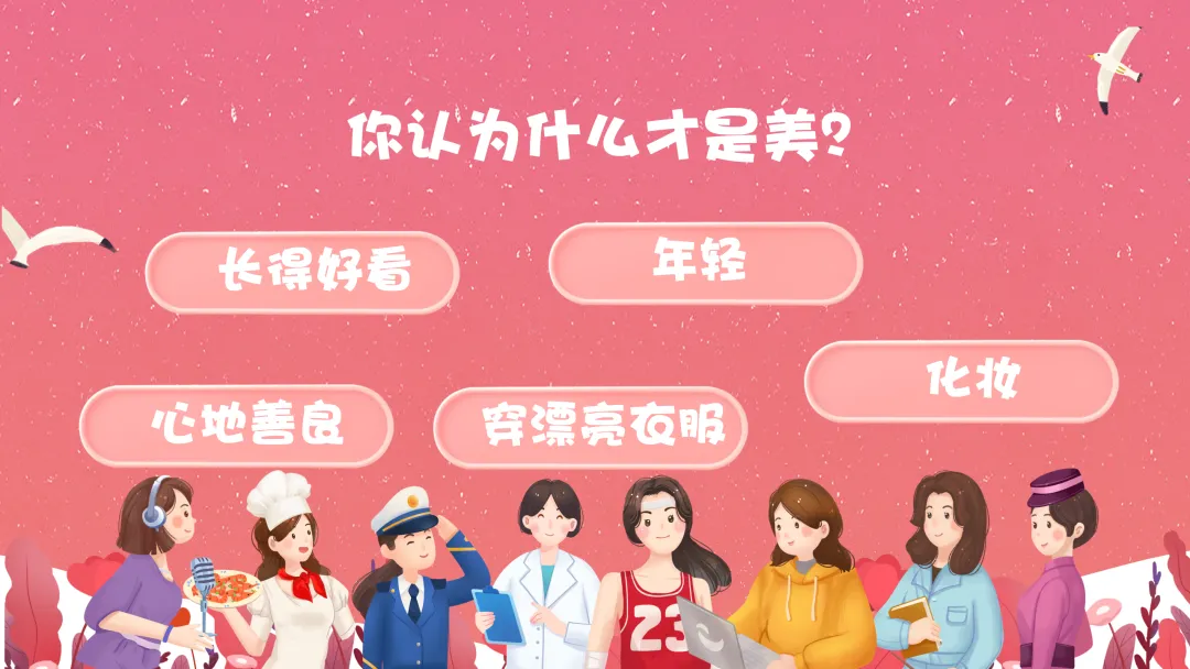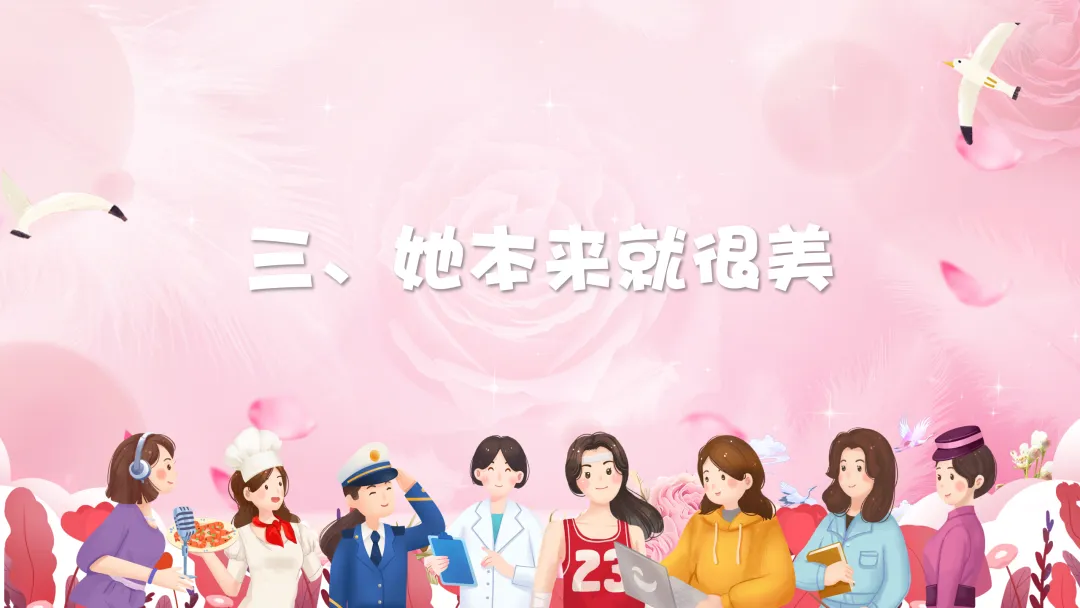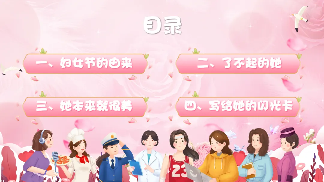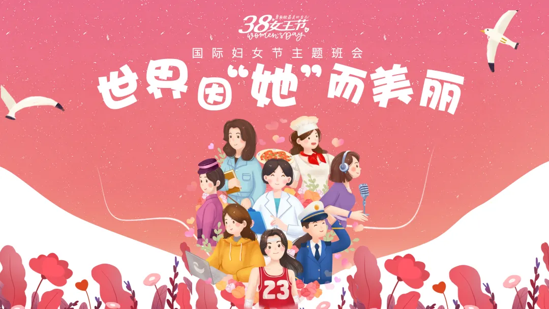 班会背景 | “三八”国际妇女节是全世界妇女的节日,也是女性争取平等、自由、发展的象征。在当今社会,女性在各个领域都发挥着不可或缺的作用,她们以坚韧、智慧和力量,为社会的进步和发展做出了巨大贡献。然而,社会中仍存在一些对女性的误解和偏见,甚至部分女性自身也面临着自我认同和价值实现的困境。通过本次主题班会,旨在引导学生深入了解妇女节的意义,感受女性的伟大与美丽,同时鼓励学生关注身边的女性,尊重她们的个性与价值,传递爱与温暖 | ||