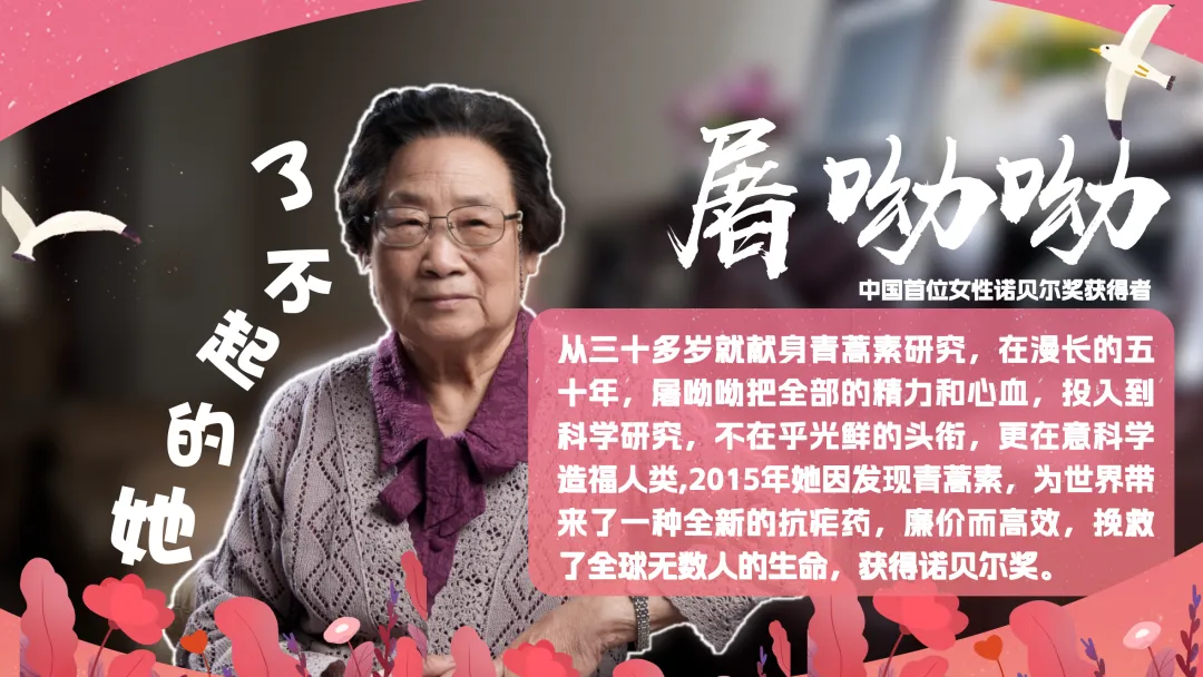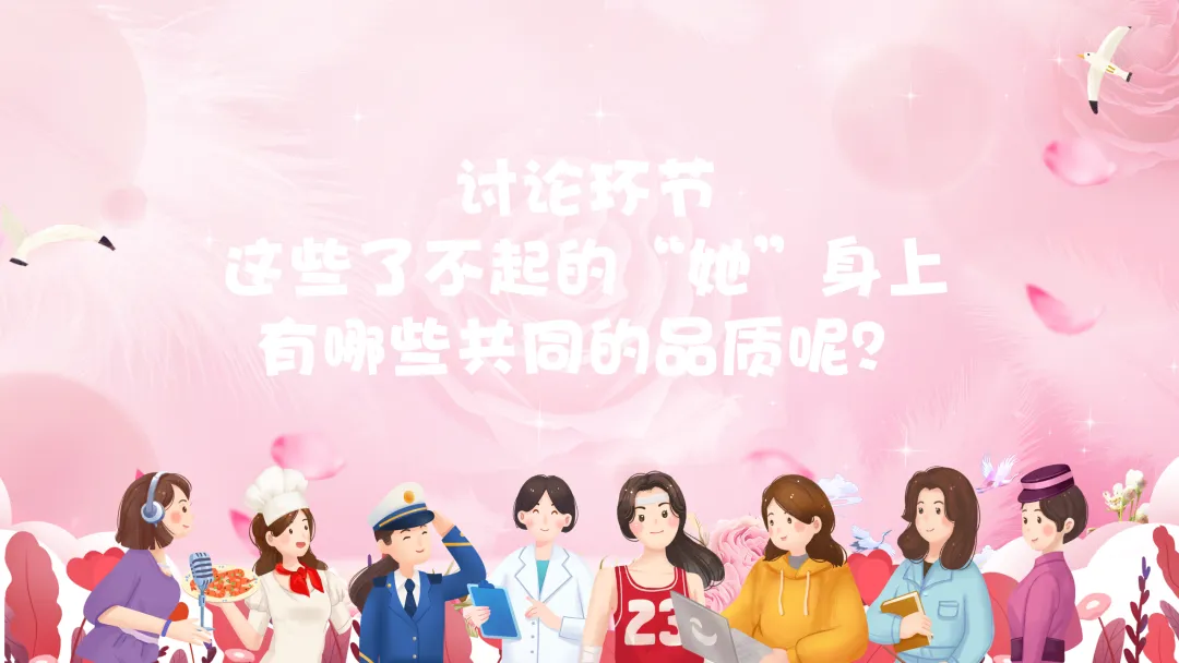 (二)了不起的“她” 1、人物介绍: 屠呦呦:展示屠呦呦的图片或视频,讲述她发现青蒿素的历程及其对全球医学的贡献。 刘洋:介绍刘洋作为中国首位女航天员的事迹,强调她为国家航天事业做出的贡献。 张伟丽:播放张伟丽比赛的精彩瞬间,讲述她从平凡到卓越的奋斗历程。 郎平:展示郎平带领中国女排夺冠的图片,讲述她为中国排球事业的付出。 华春莹:介绍华春莹在外交领域的表现,强调她的智慧和勇气。 张桂梅:讲述张桂梅扎根山区教育、改变贫困女孩命运的故事。 谷爱凌:播放谷爱凌比赛视频,讲述她勇于突破自我、挑战极限的精神。 2、小组讨论:学生分组讨论这些女性身上的共同品质,每组推选一名代表发言。 3、教师总结:这些女性虽然来自不同领域,但她们都具有坚韧不拔的毅力、勇于担当的精神和无私奉献的品质。她们用自己的行动诠释了什么是“了不起的她”。 | 通过介绍不同领域的杰出女性,让学生感受到女性的伟大与力量,激发学生对女性的敬佩之情,同时引导学生学习她们的优秀品质。 | ||